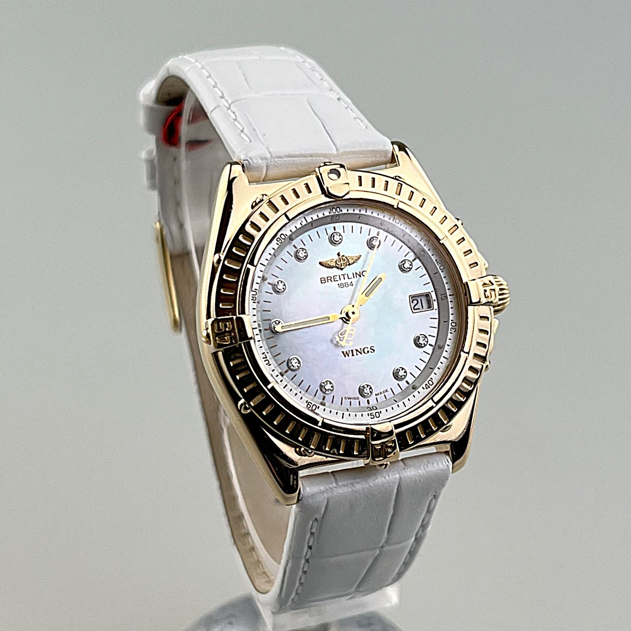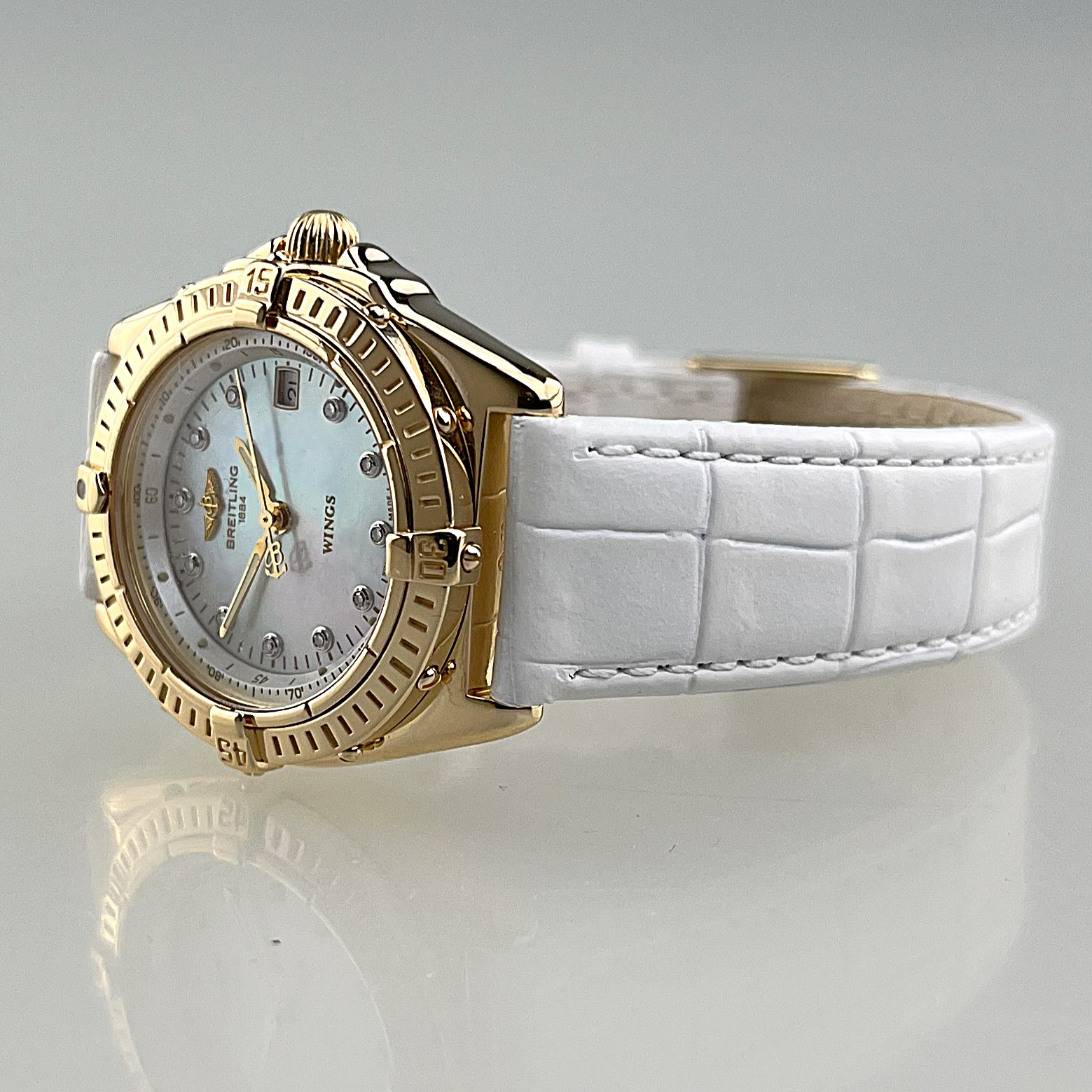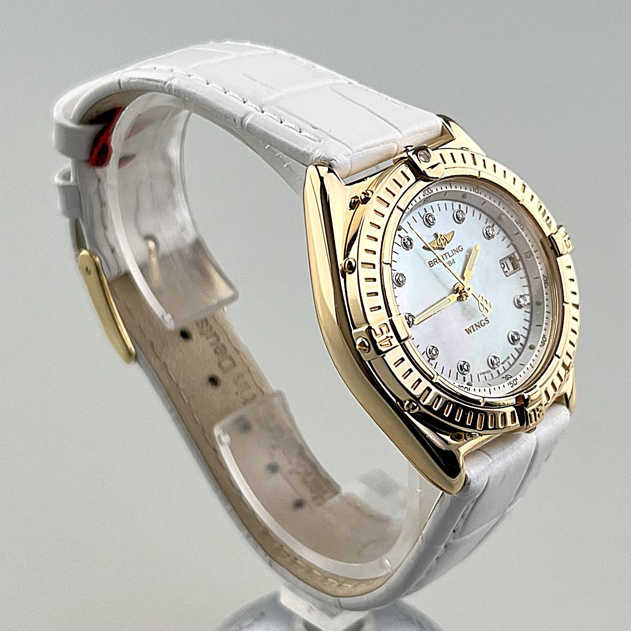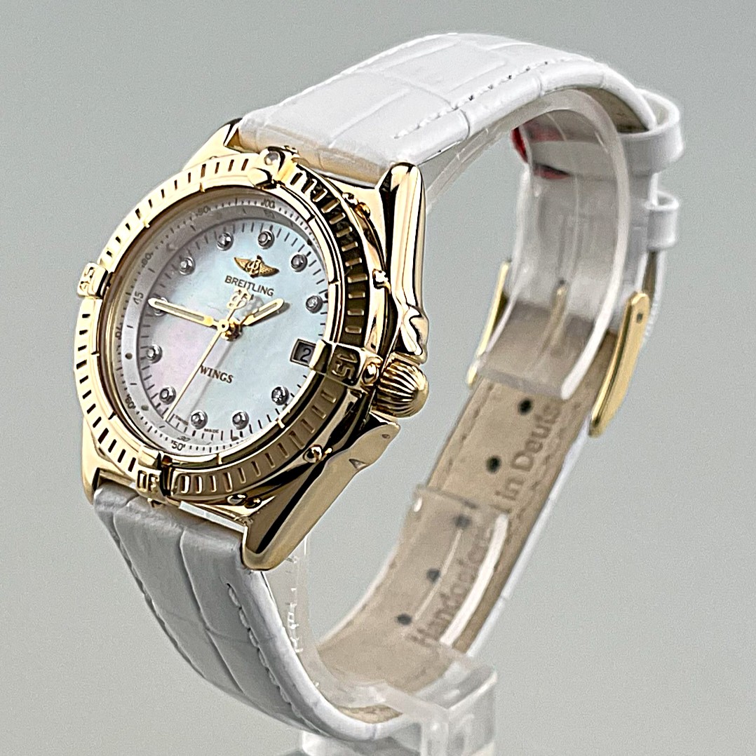 Breitling Wings Lady, Ref. A67050, hochglanzpoliertes Gelbgoldgehäuse (18 Karat), 31 mm, weißes Perlmuttzifferblatt mit 11 Diamanten besetzt, Datum