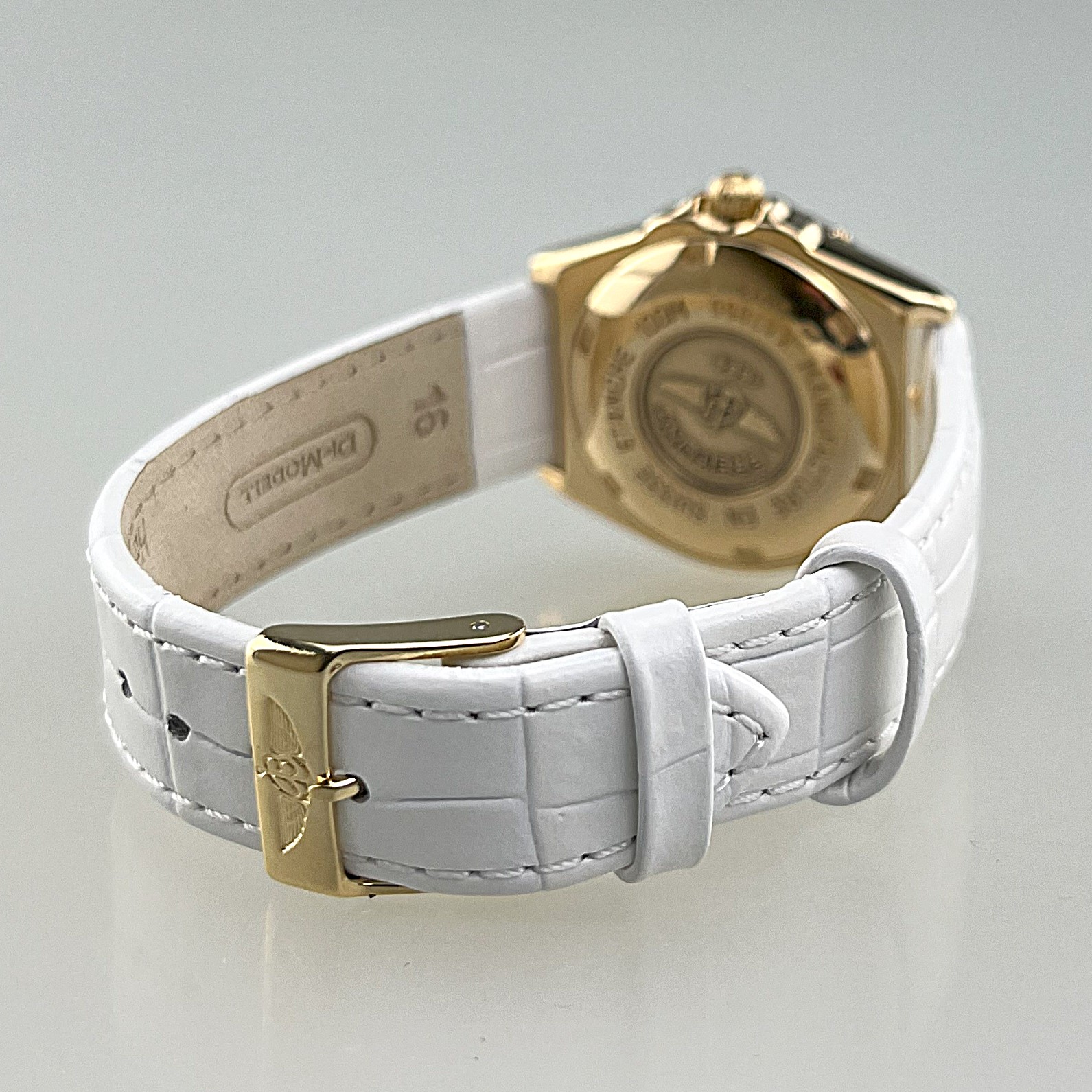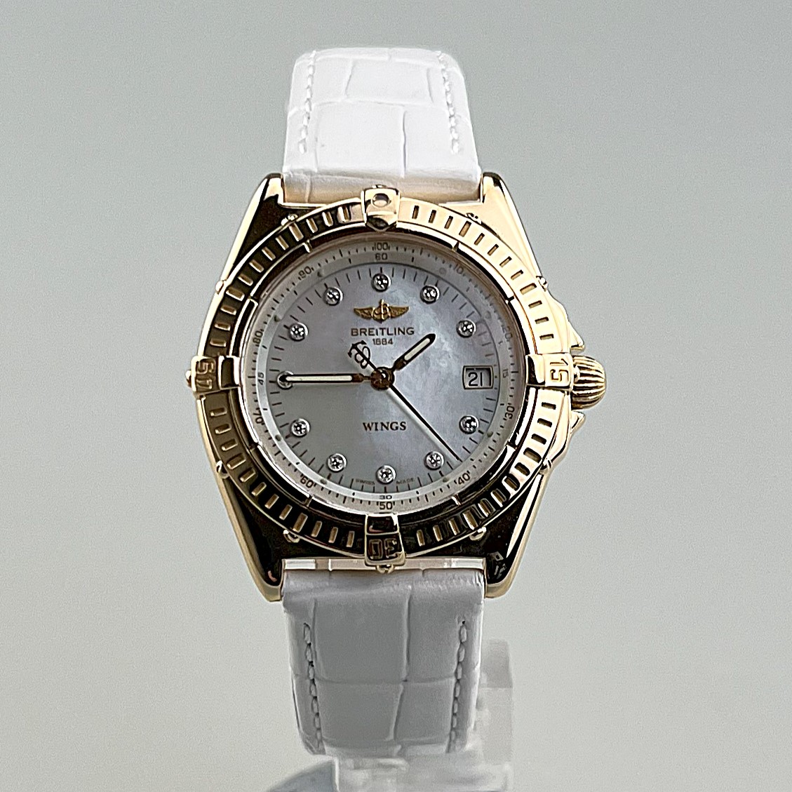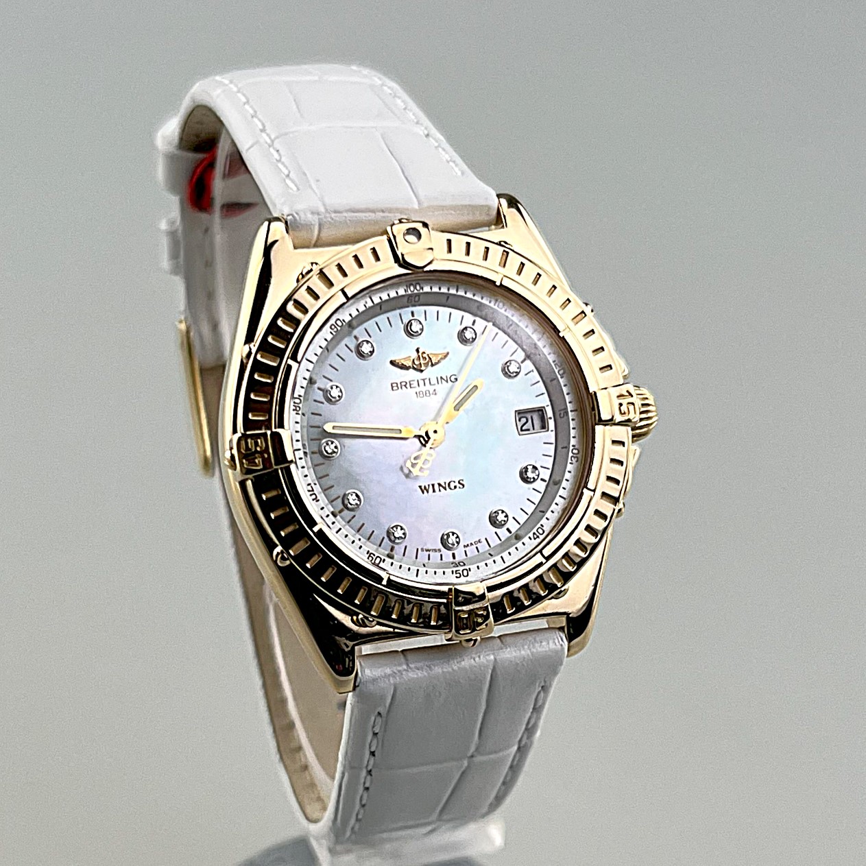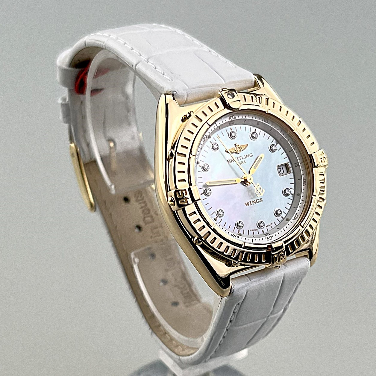 Breitling Wings Lady, Ref. A67050, hochglanzpoliertes Gelbgoldgehäuse (18 Karat), 31 mm, weißes Perlmuttzifferblatt mit 11 Diamanten besetzt, Datum