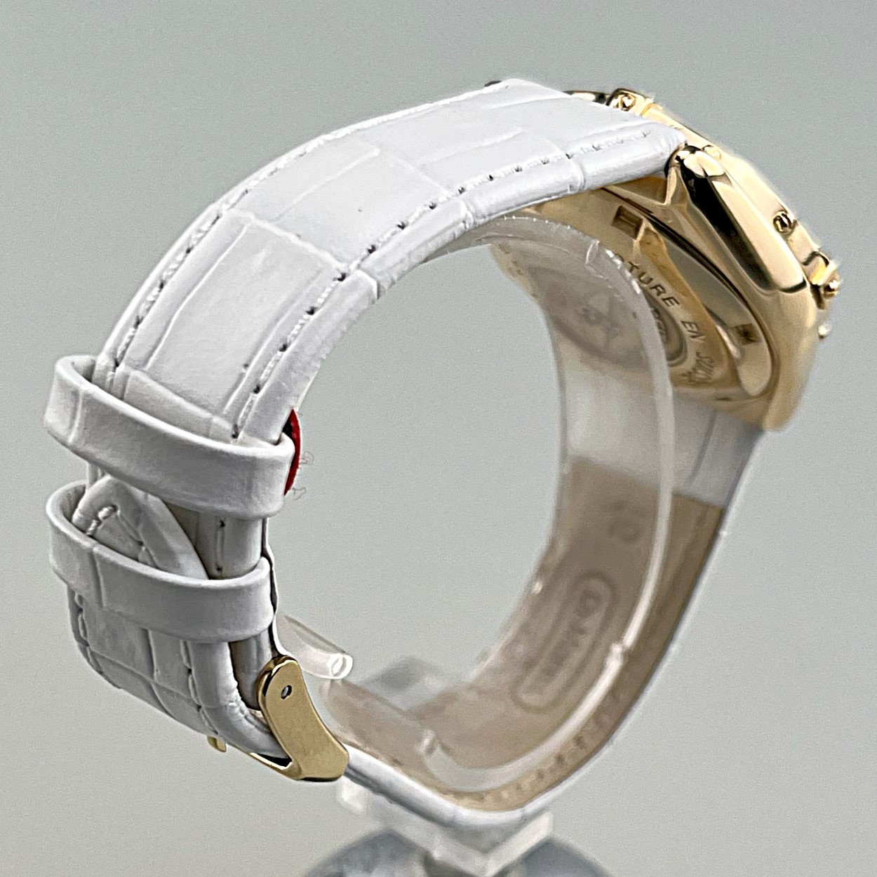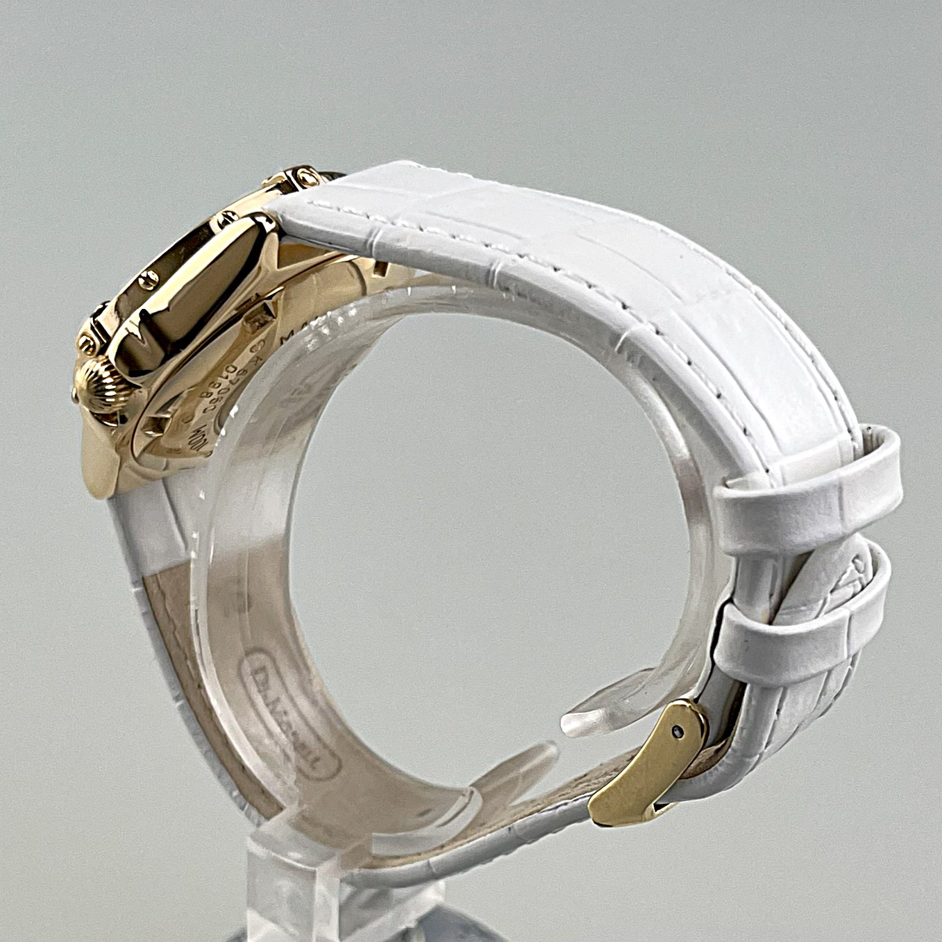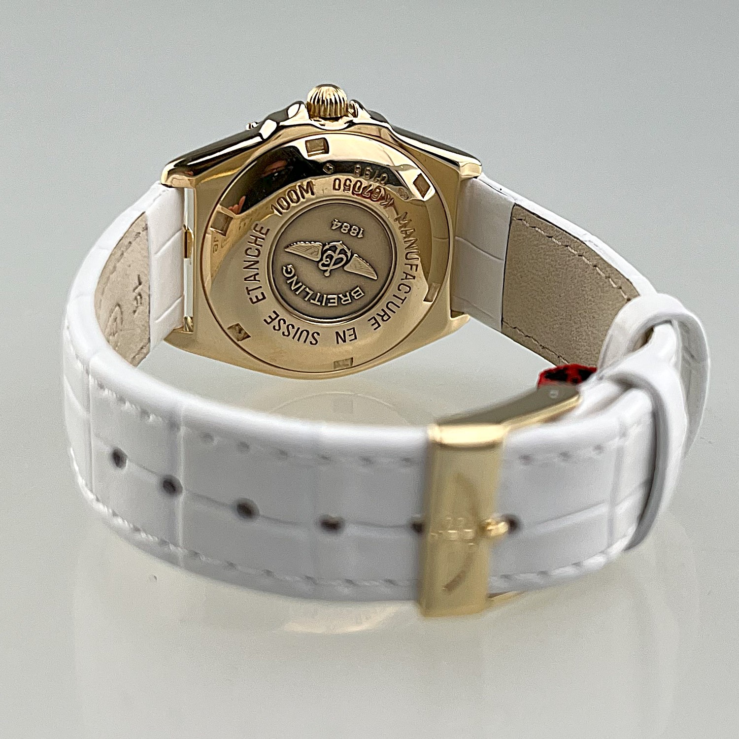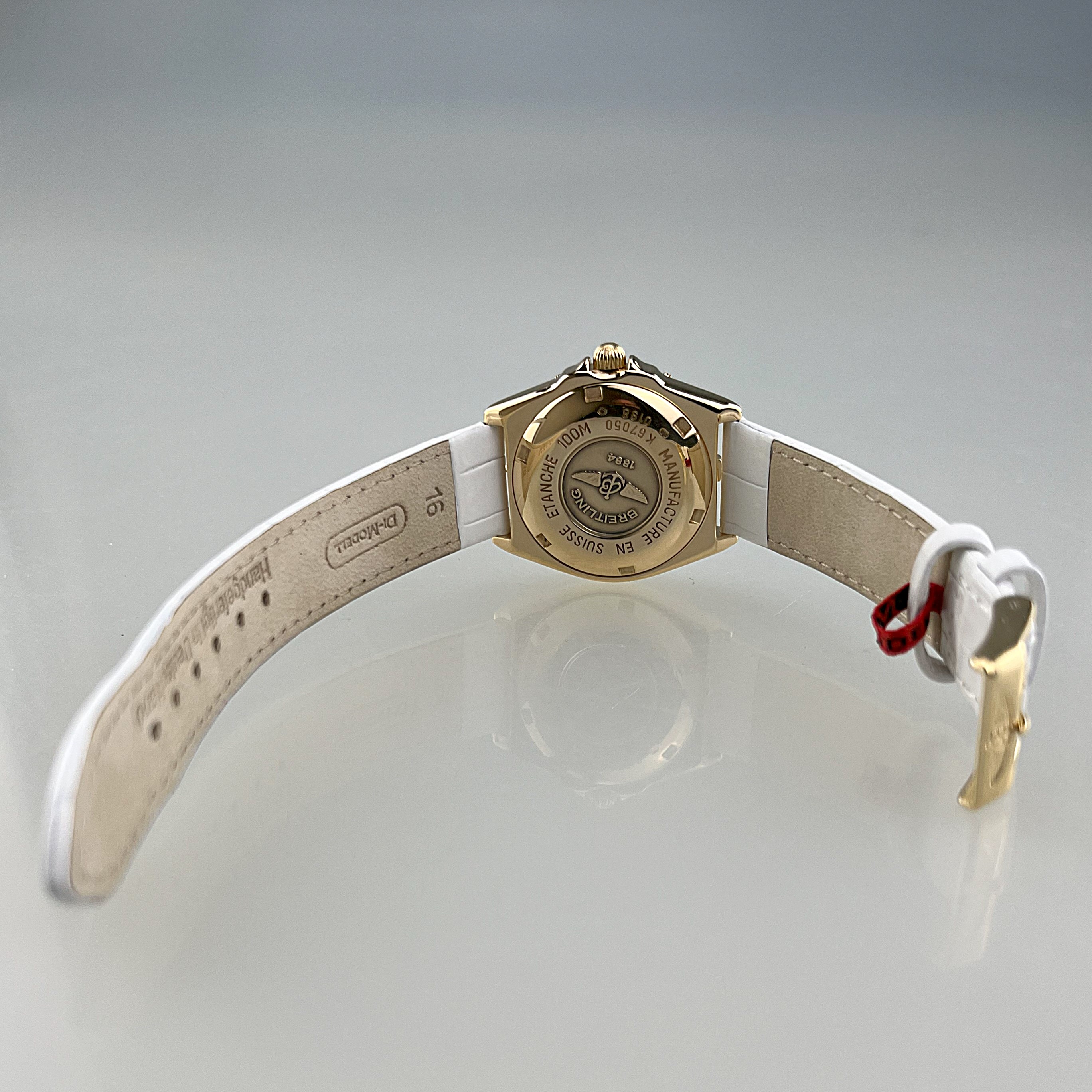 Breitling Wings Lady, Ref. A67050, hochglanzpoliertes Gelbgoldgehäuse (18 Karat), 31 mm, weißes Perlmuttzifferblatt mit 11 Diamanten besetzt, Datum