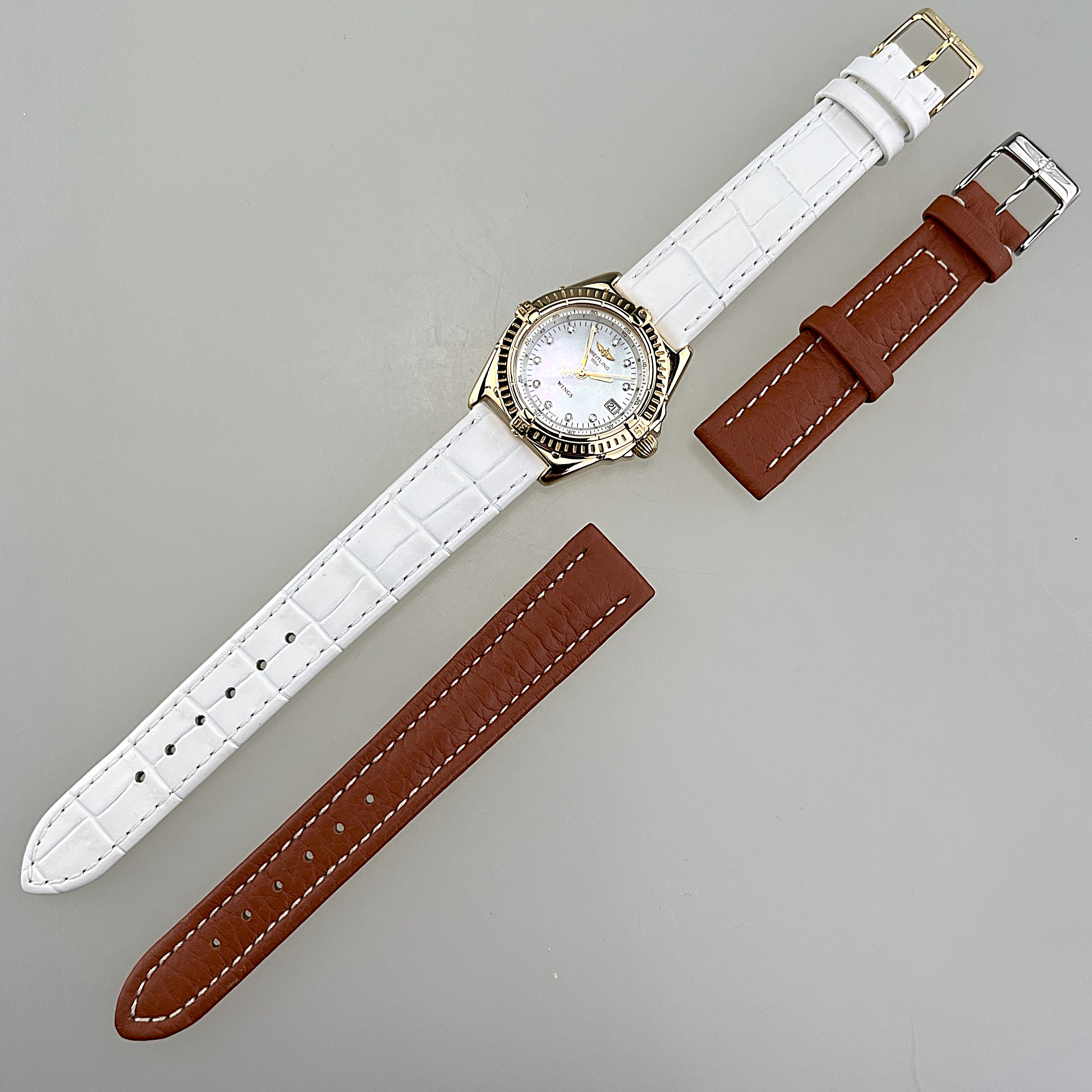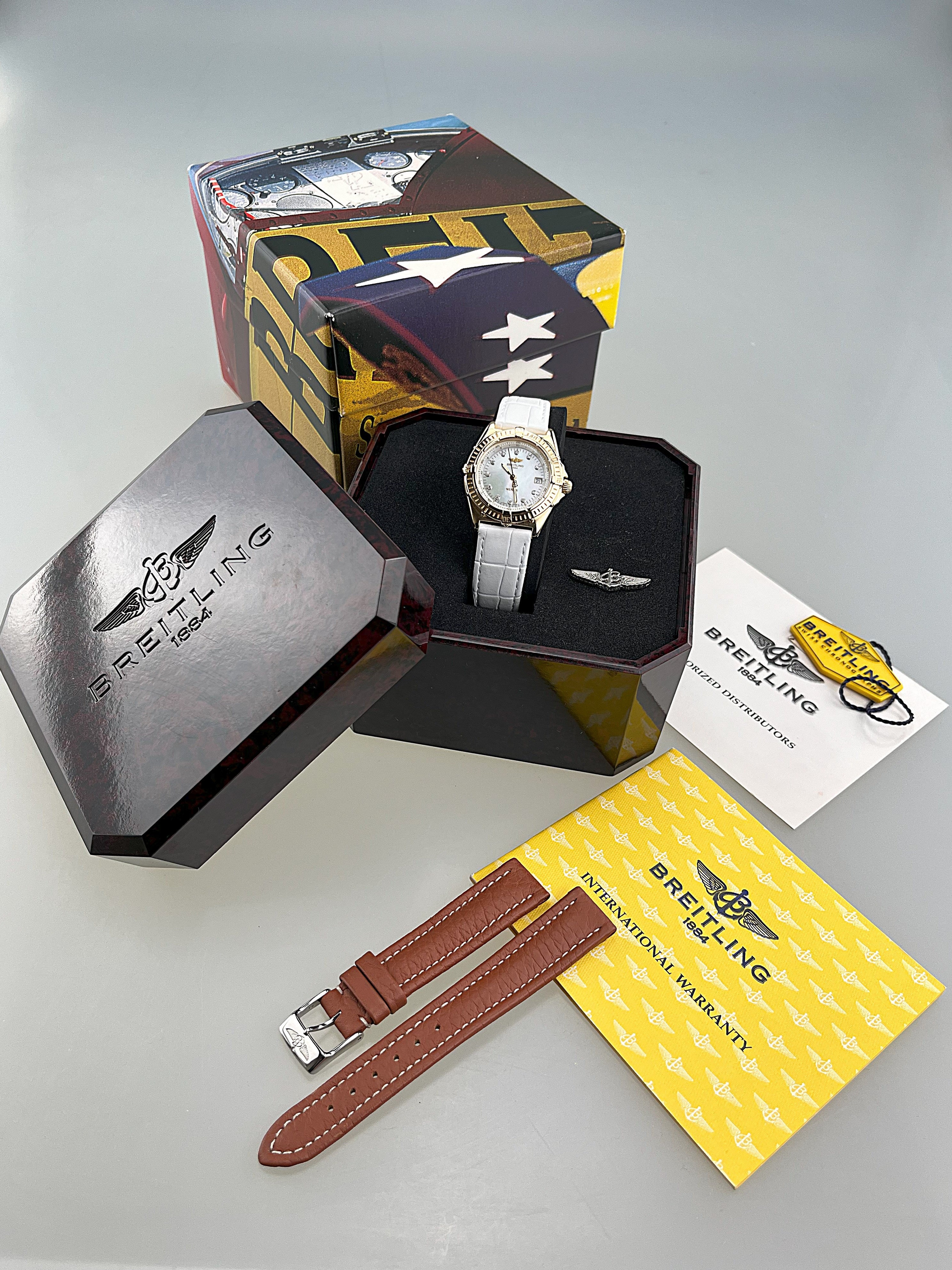 neues weißes Lederarmband mit goldener Original-Breitling Dornschließe (18 K), zusätzlich neues braunes Original Breitling Kalbslederarmband mit original Breitling Edelstahl-Dornschließe, Breitling Box und Breitling Papiere