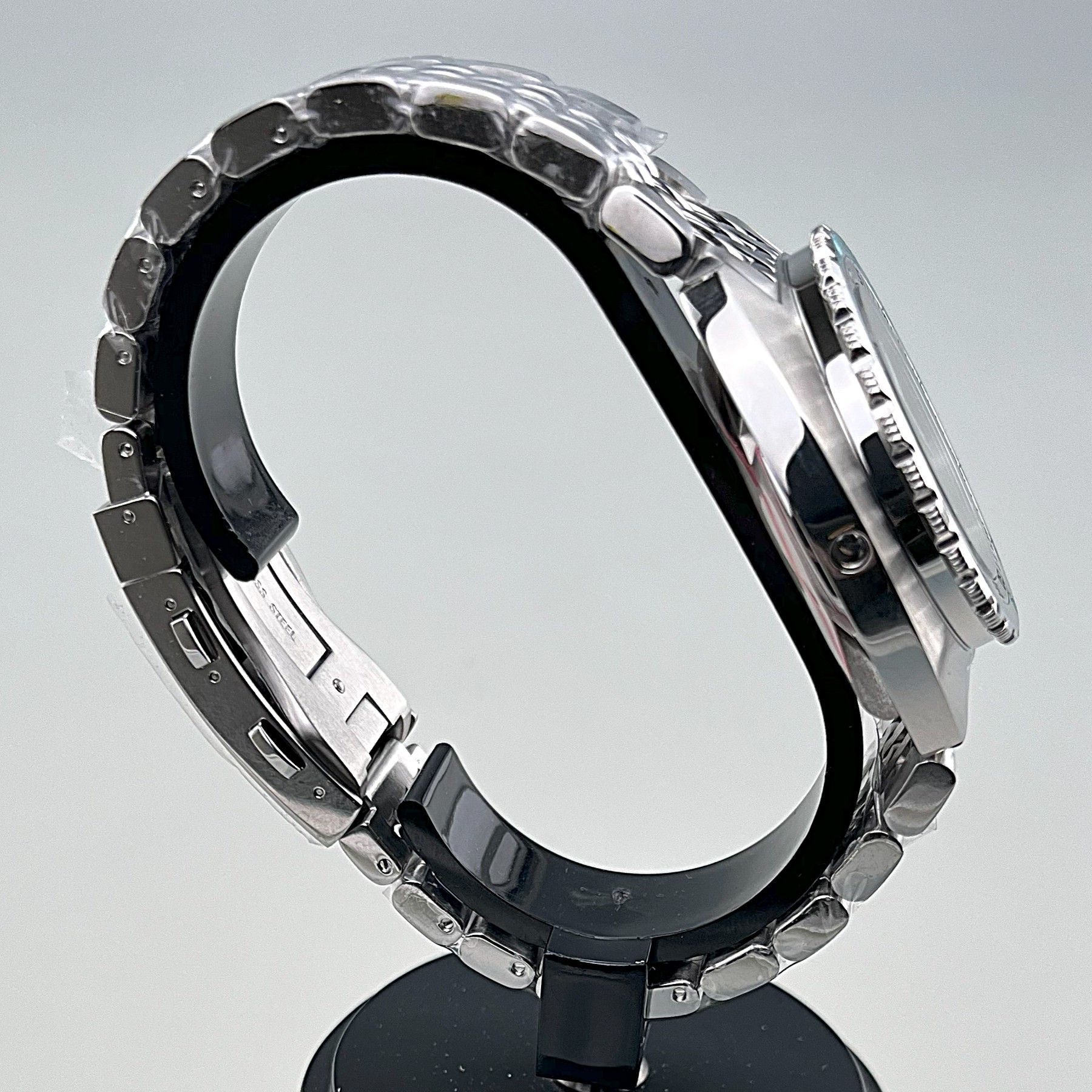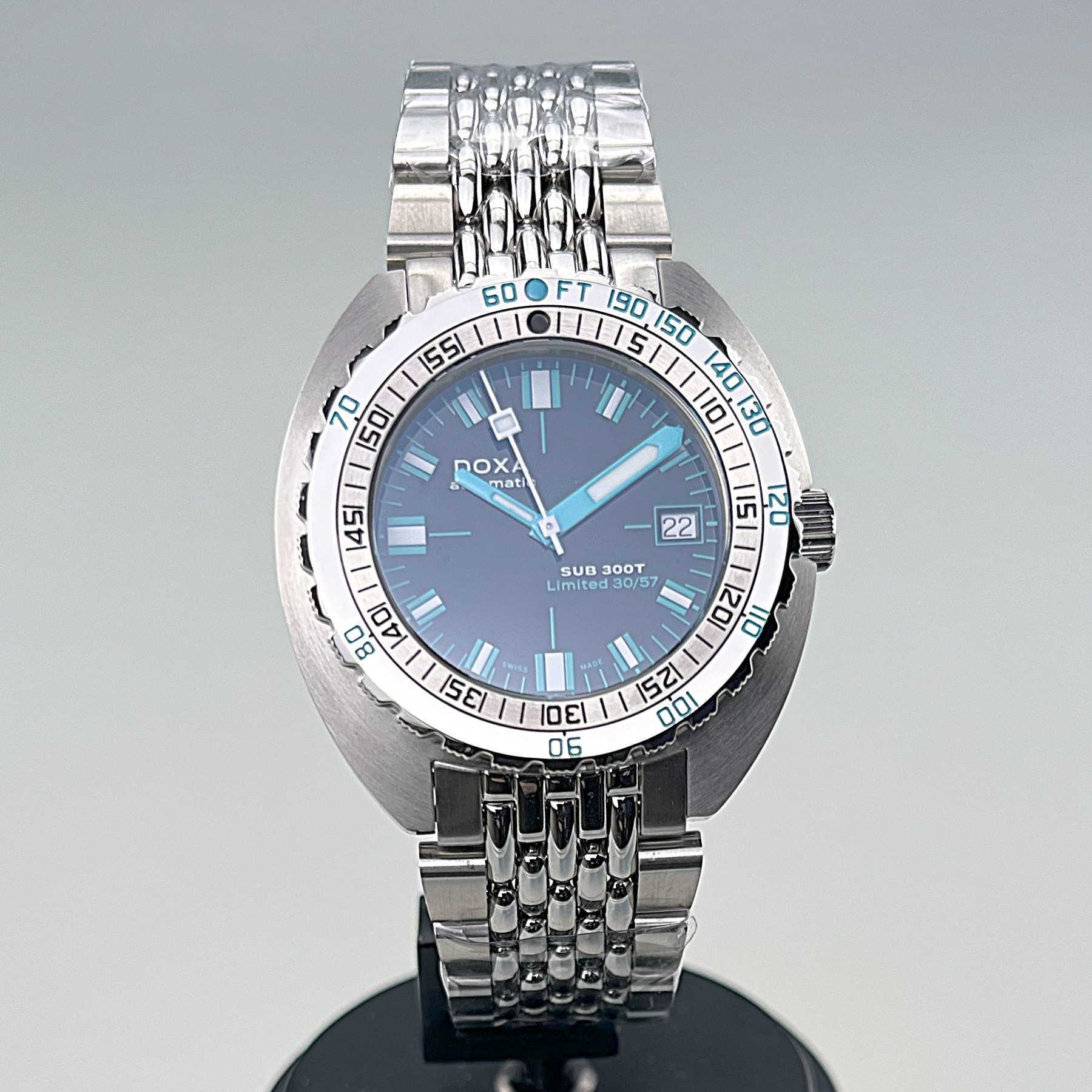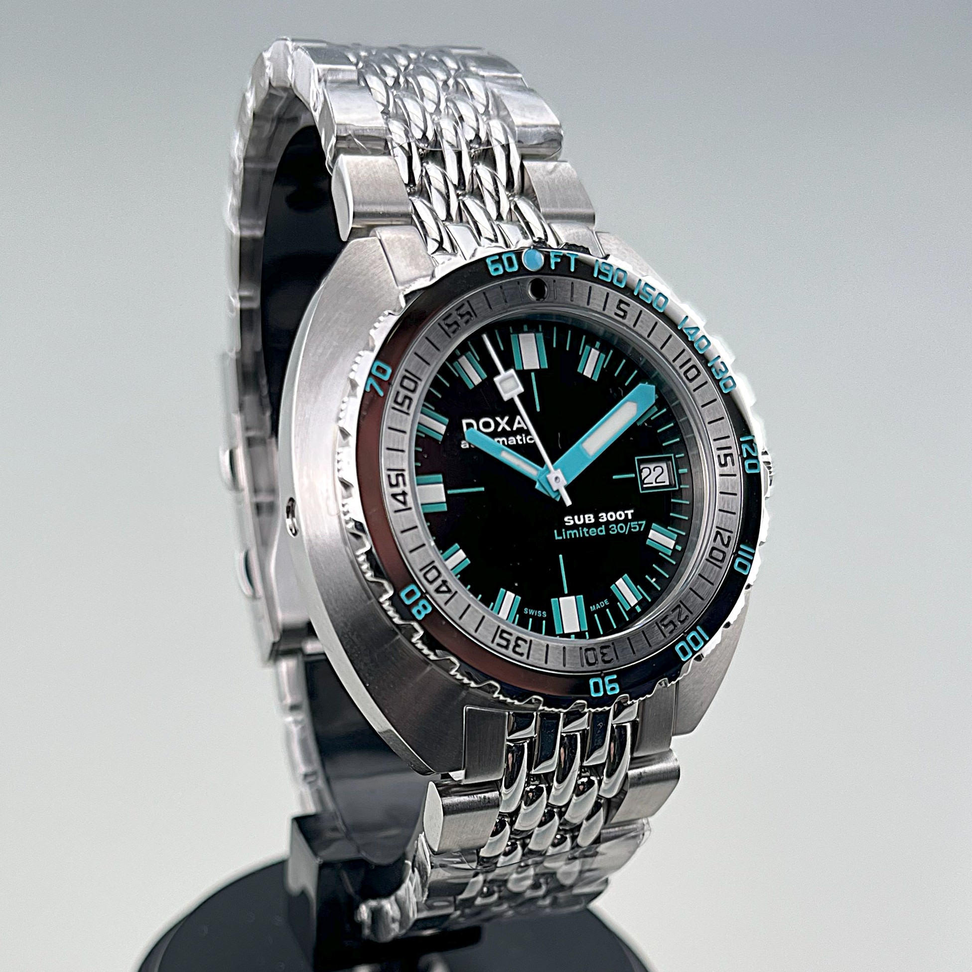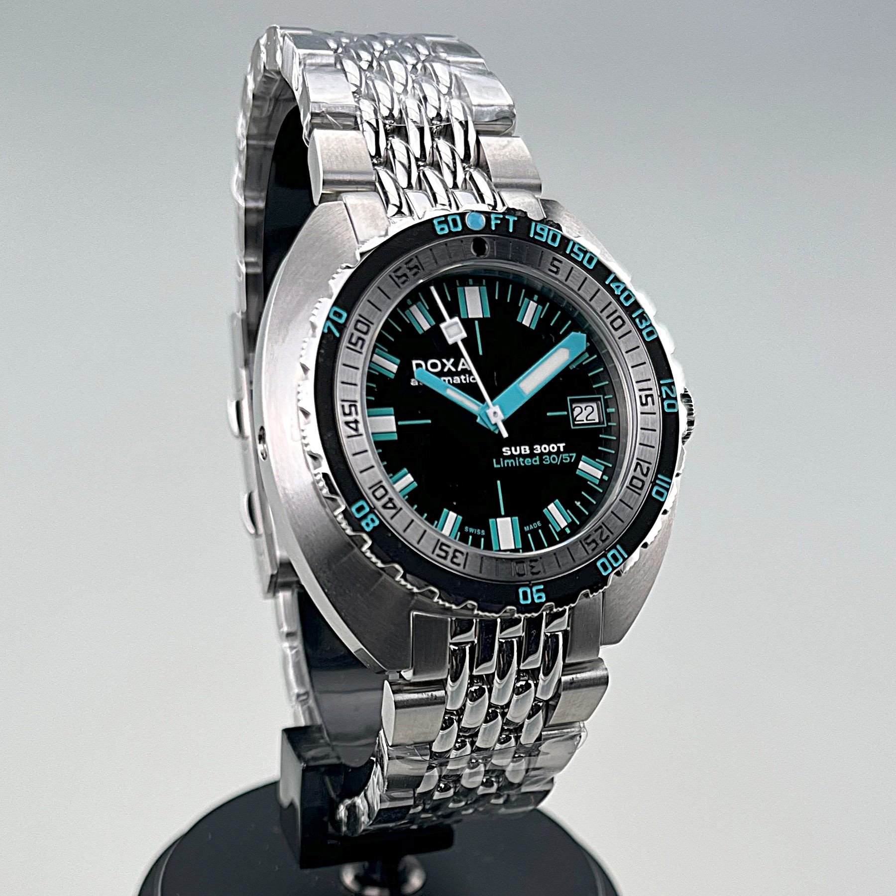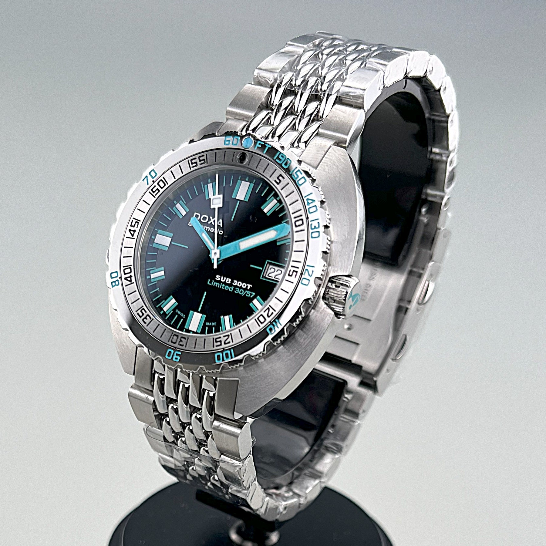 Diese 3-Zeiger-Taucheruhr ist in 8 klassischen Zifferblattfarben erhältlich und verbindet die ästhetischen Werte der SUB 300T Conquistador mit den technischen Raffinessen, die eine Hochleistungs-Taucheruhr von heute auszeichnen. Die vorliegende DOXA SUB 300T California Sea ist ein auf 57 Stück weltweit limitiertes Sondermodell mit einem außergewöhnlichen Zifferblatt in einer besonderen Farbkonstellation aus schwarz und türkis. Auch die zweigeteilte Lünette ist sowohl mit schwarzen Ziffern auf dem Innenring und türkisen Ziffern auf dem Außenring versehen.