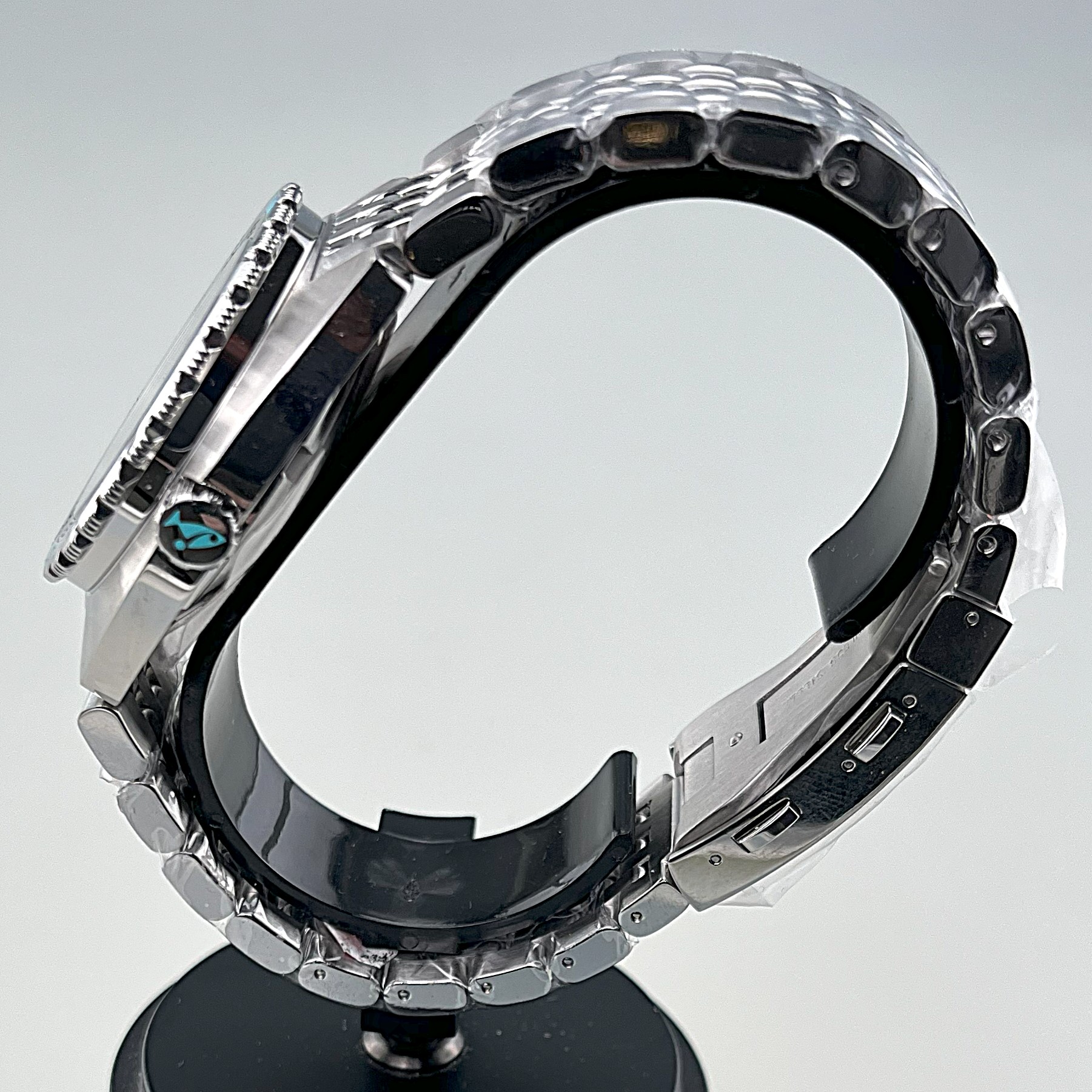 Sonderzifferblatt schwarz mit türkis / weißen Indizes und türkis / weißem Zeigerspiel