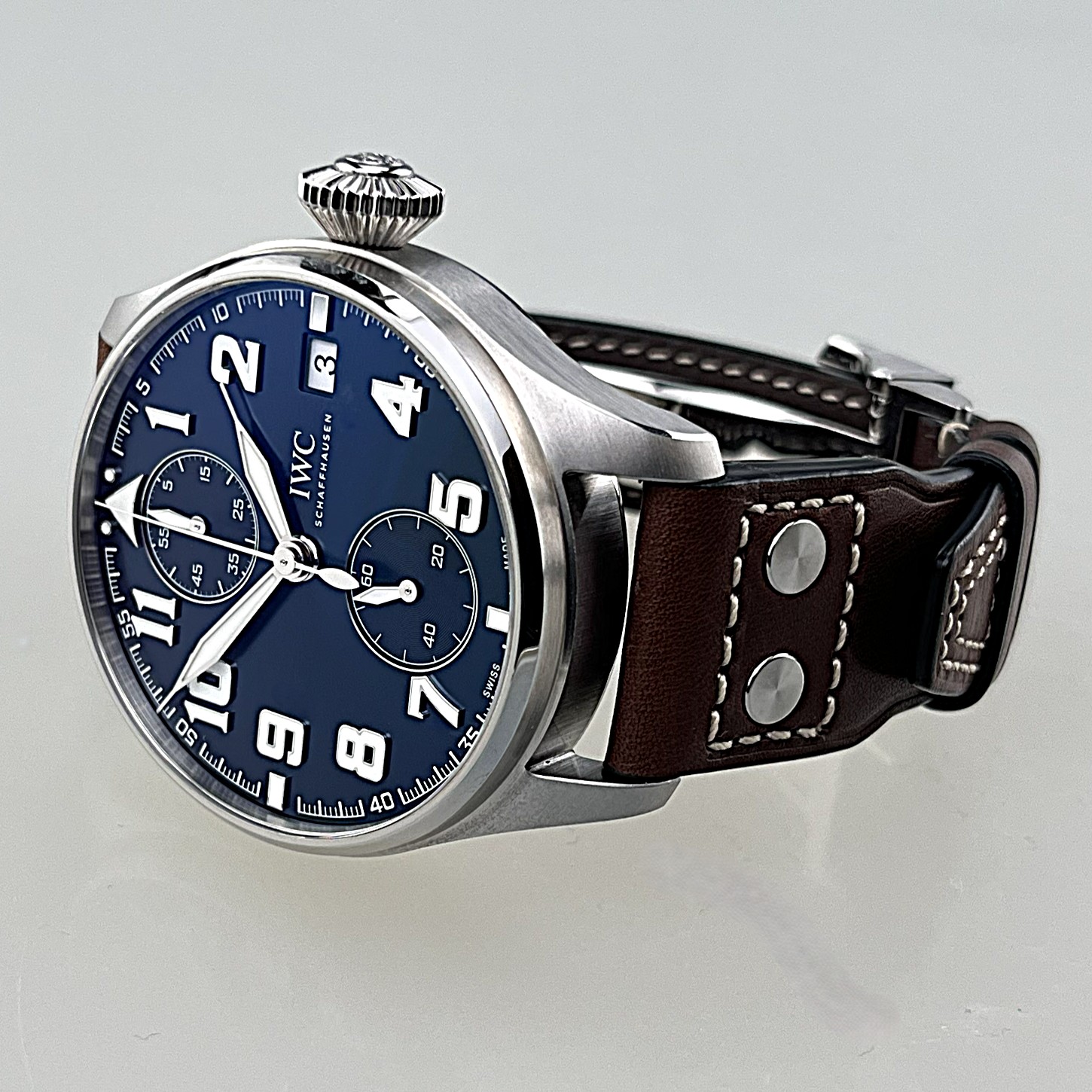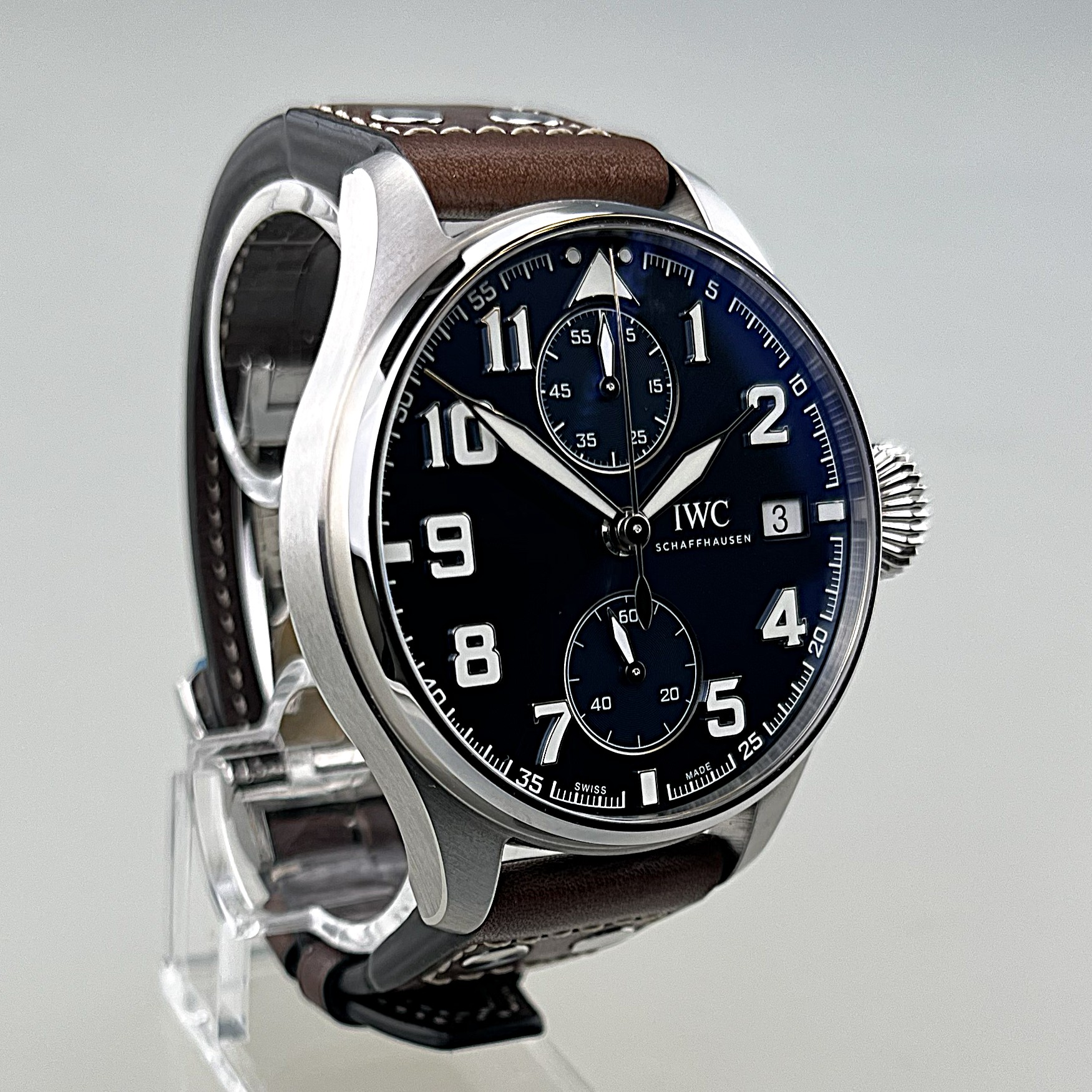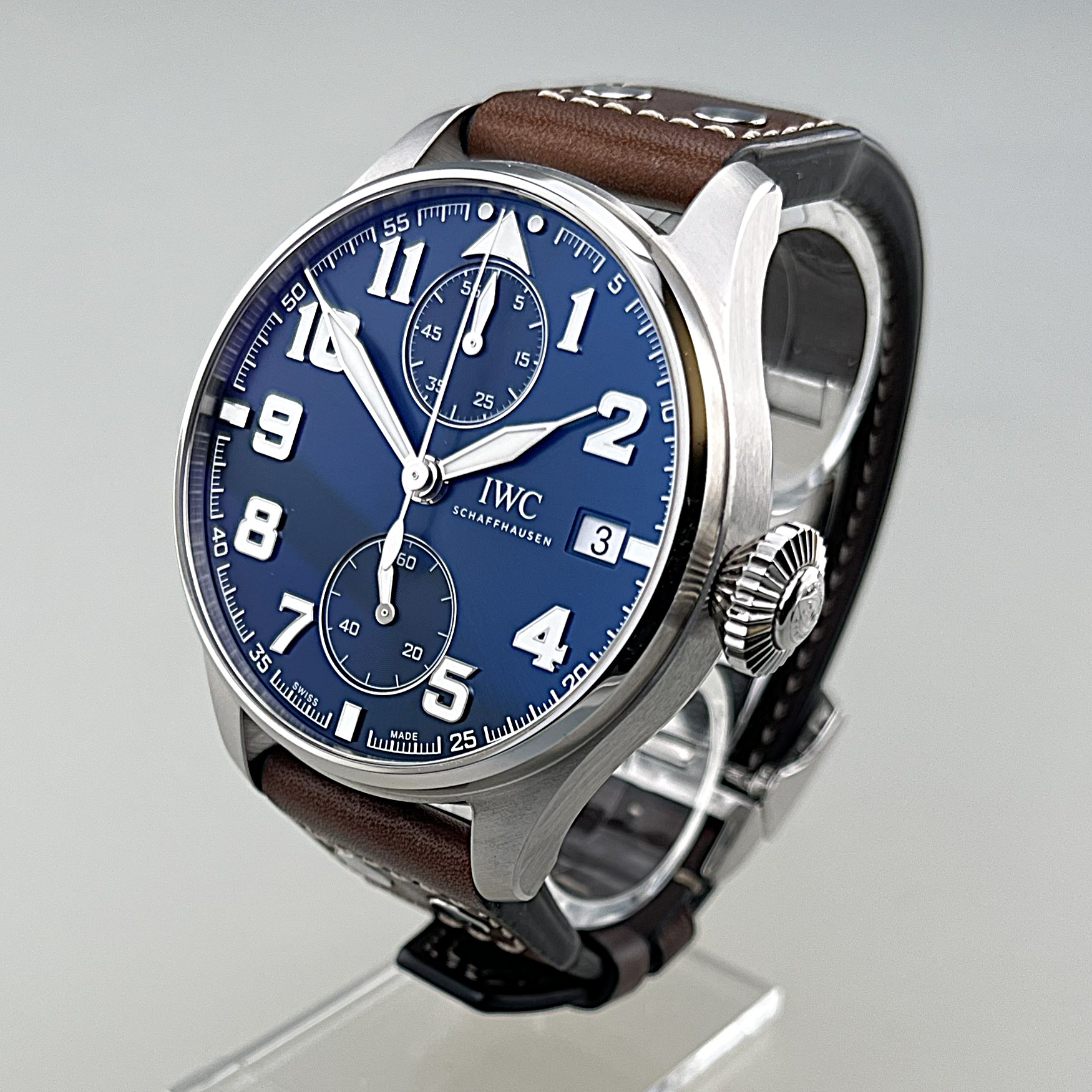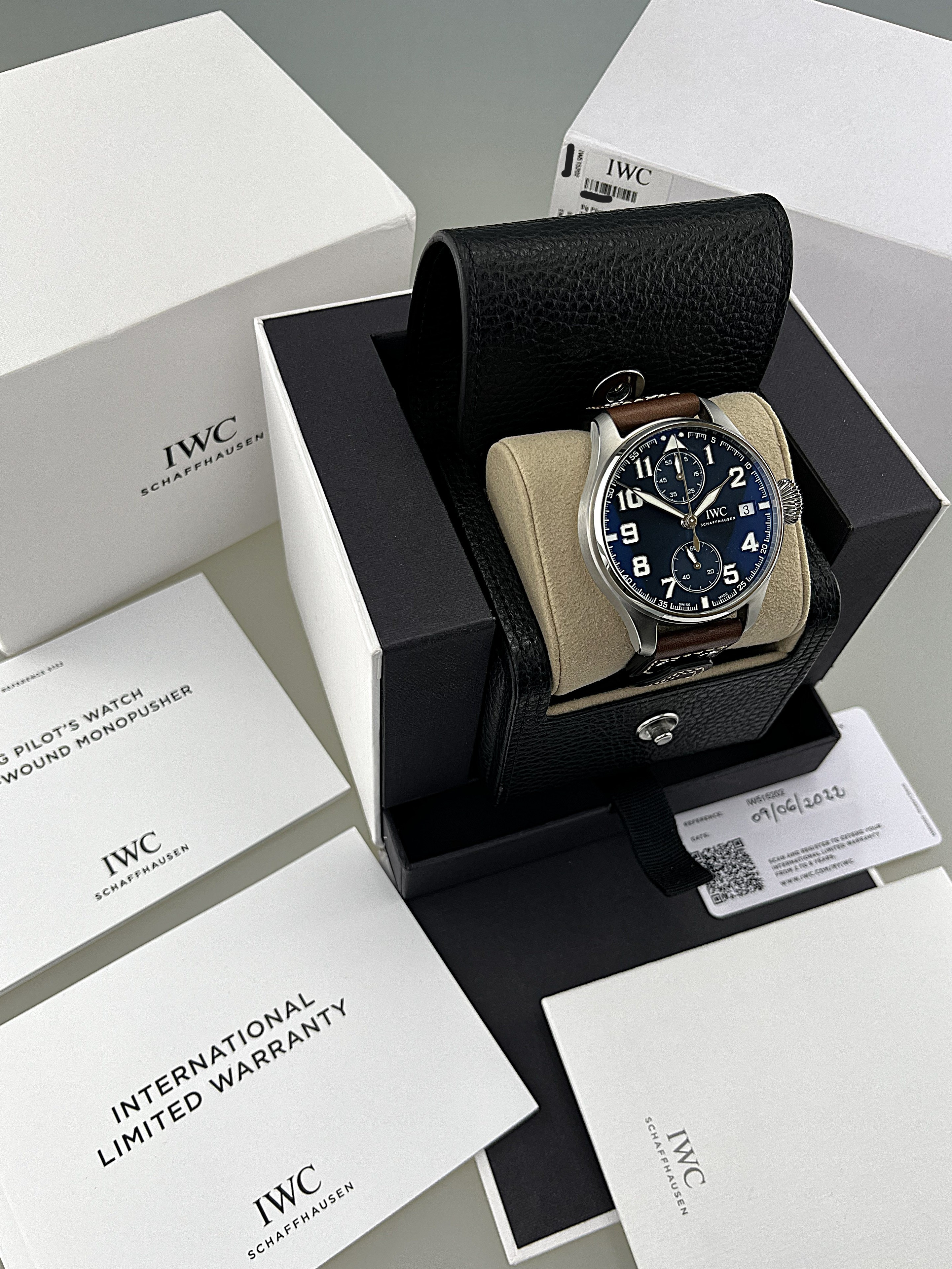 IWC Big Pilot's Watch Monopusher Edition "Le Petit Prince, IW515202, limitiert, ein Exemplar aus 500 Stück weltweit, Edelstahl Gehäuse, Handaufzug, Durchmesser 46 mm, Höhe 14,6 mm, dunkelblaues Zifferblatt mit blauen Totalisatoren, braunes Kalbslederarmband, Bandbreite 22.0 mm, Breite der Schließe 18 mm, neu/ungetragen (Gehäuseboden und Schließe sind noch mit Original IWC-Schutzfolie versehen), Full Set aus 06/2022
