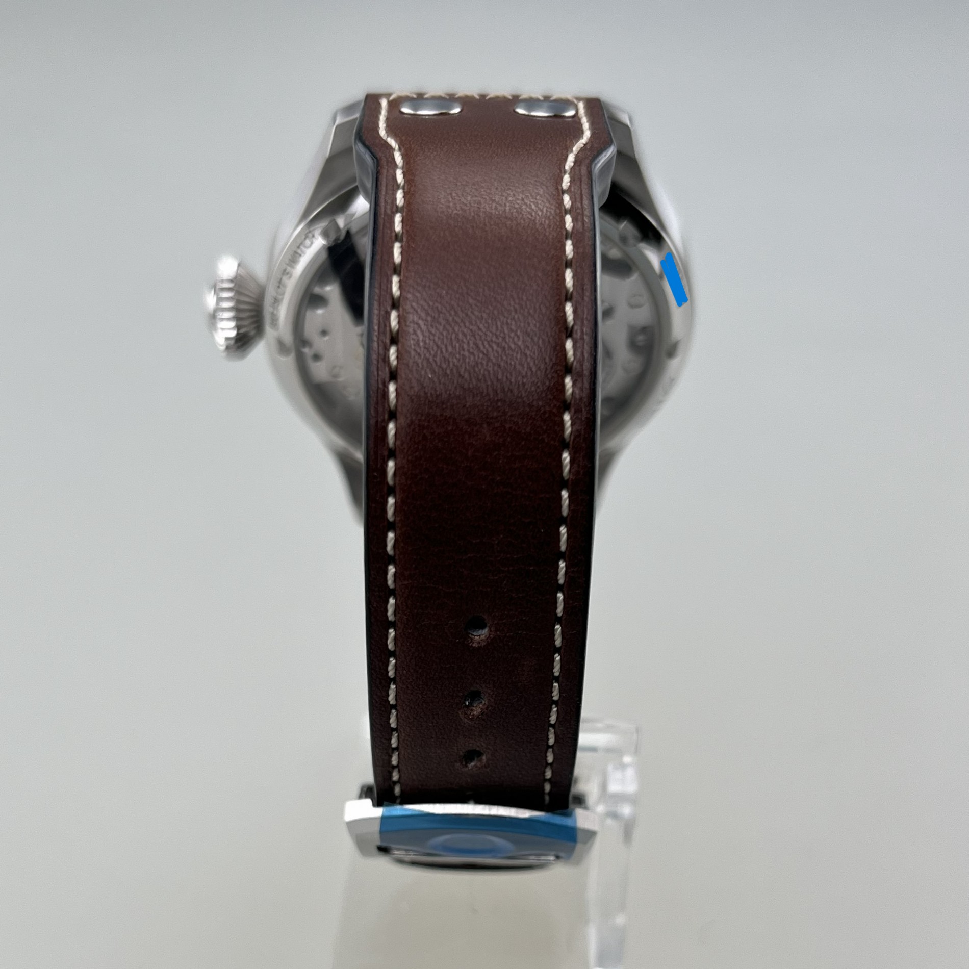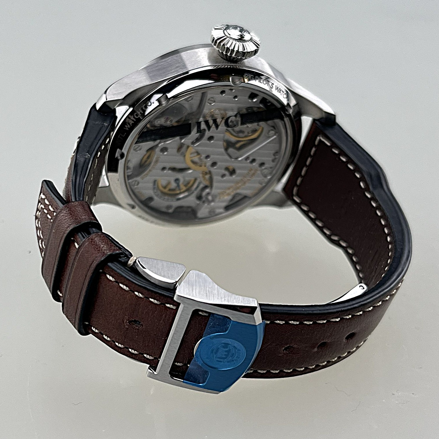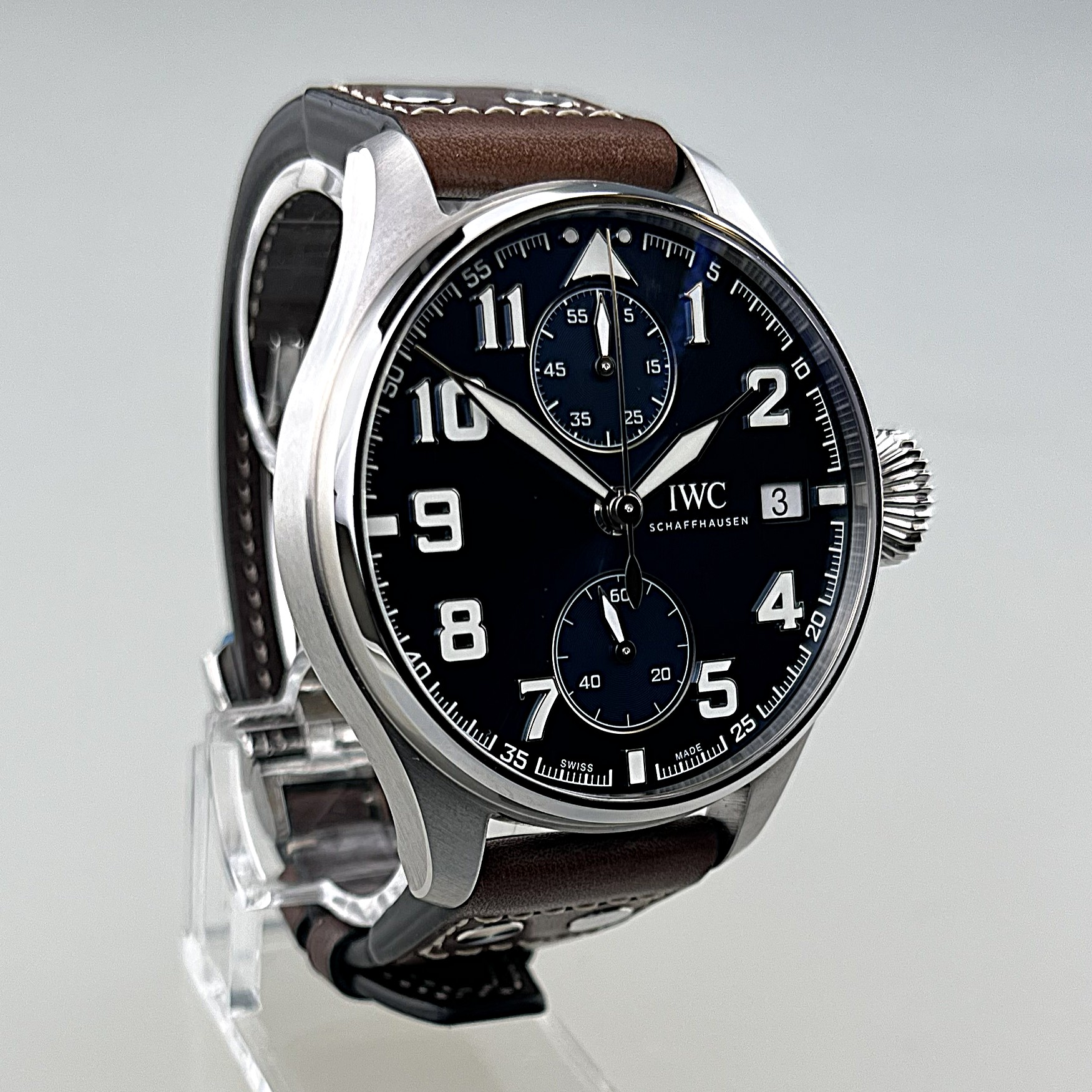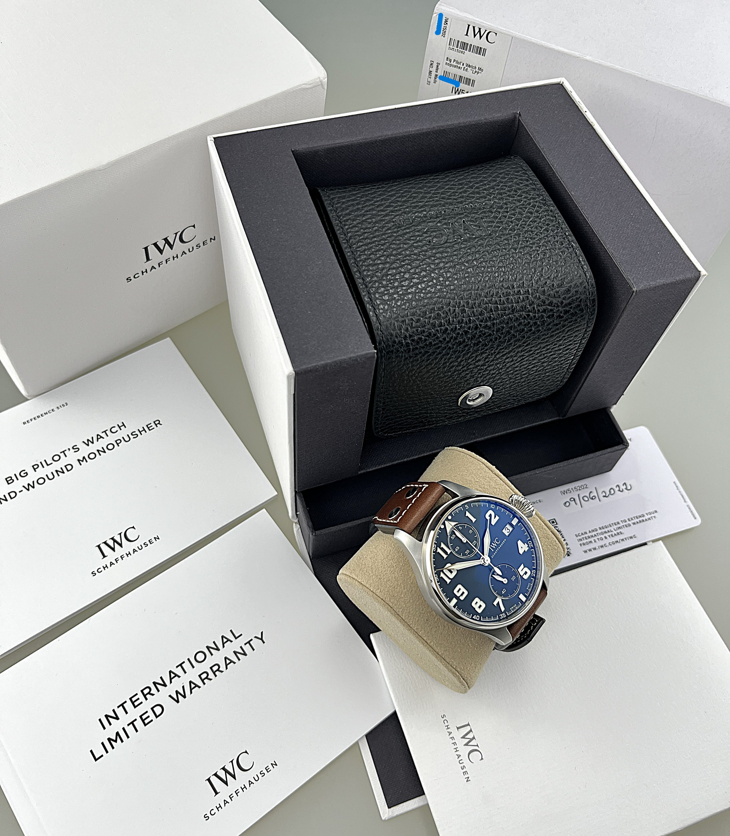 IWC Big Pilot's Watch Monopusher Edition "Le Petit Prince, IW515202, limitiert, ein Exemplar aus 500 Stück weltweit, Edelstahl Gehäuse, Handaufzug, Durchmesser 46 mm, Höhe 14,6 mm, dunkelblaues Zifferblatt mit blauen Totalisatoren, braunes Kalbslederarmband, Bandbreite 22.0 mm, Breite der Schließe 18 mm, neu/ungetragen (Gehäuseboden und Schließe sind noch mit Original IWC-Schutzfolie versehen), Full Set aus 06/2022