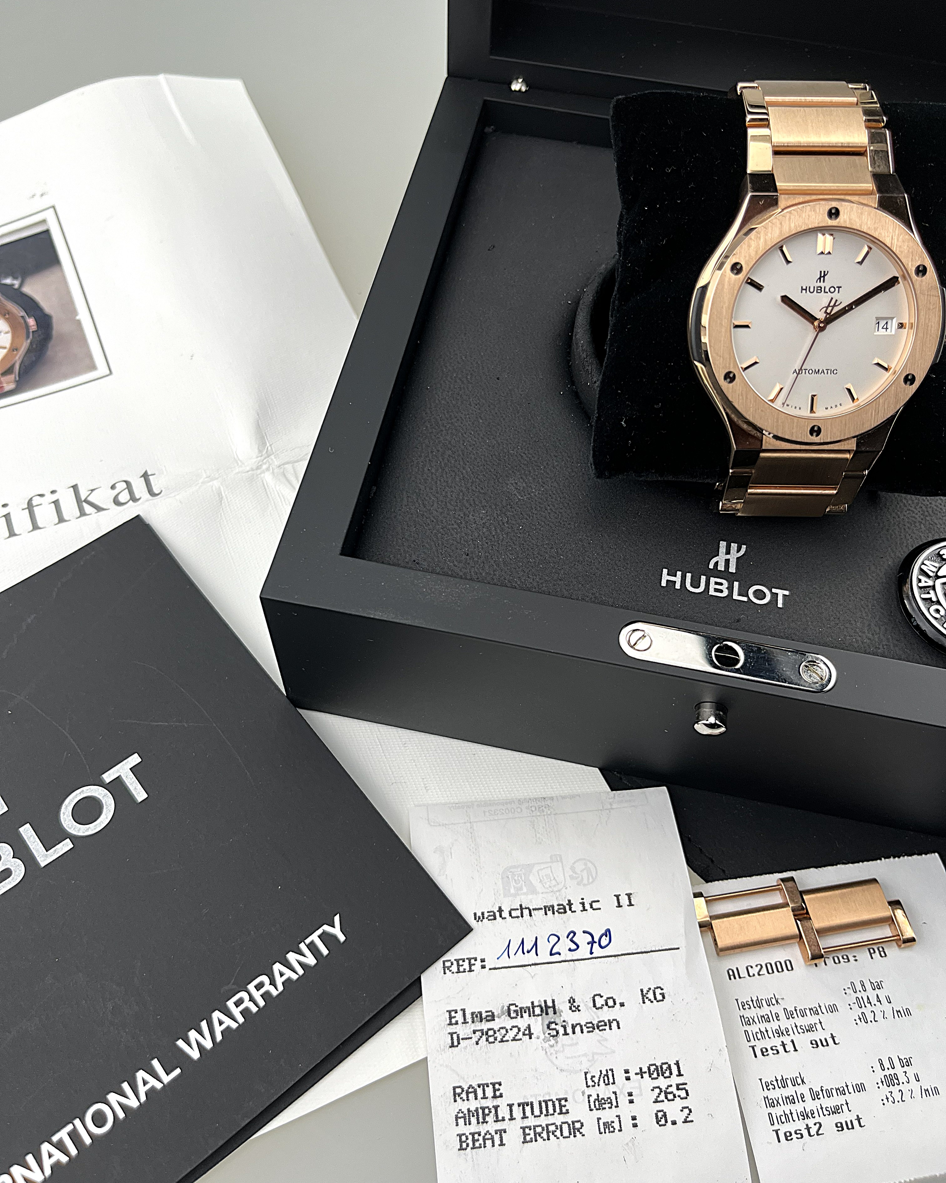 Diese außergewöhnliche Hublot Fusion King wird in einem perfekten Full Set geliefert und befindet sich im Original-Auslieferungszustand. Die Uhr wurde nie poliert. Sie wurde im September 2020 von einem deutschen Hublot Konzessionär erstmals ausgeliefert. Die Original-Erstkauf-Rechnung sowie ein Wert- und Echtheitsgutachten des ursprünglich ausliefernden Konzessionärs sind ebenfalls Bestandteil des Lieferumfangs. Die UVP betrug zu diesem Zeitpunkt 36.900,00 Euro