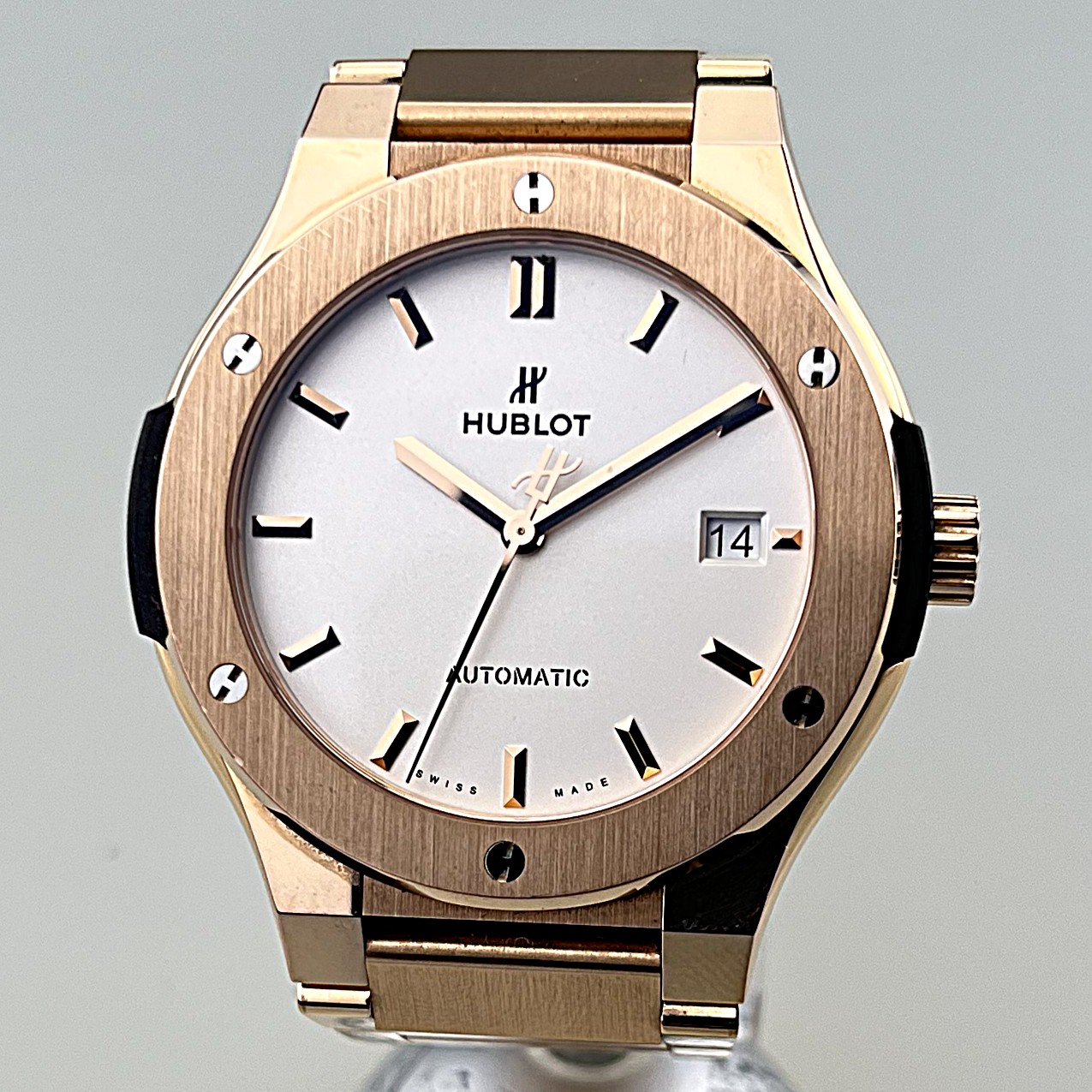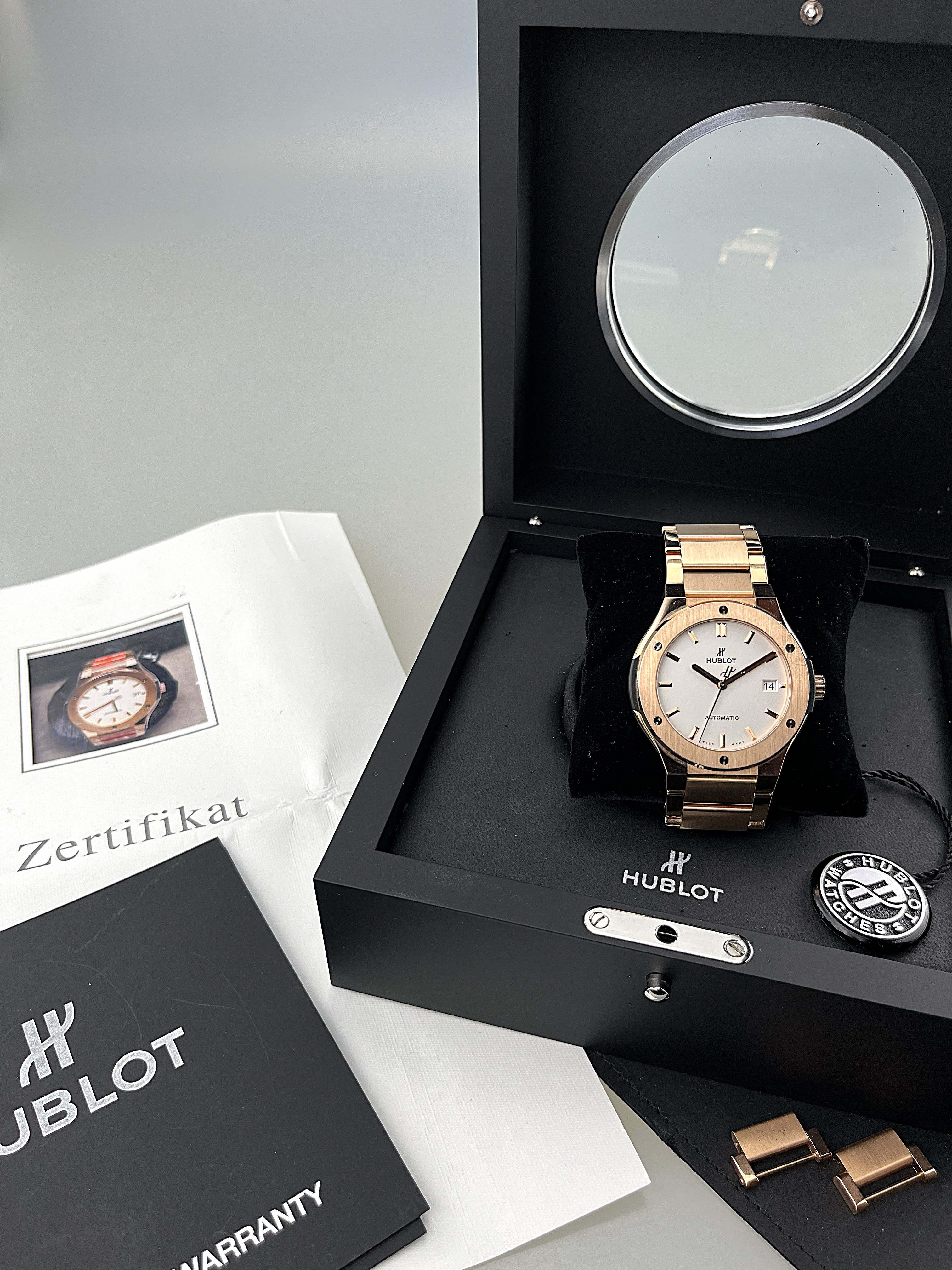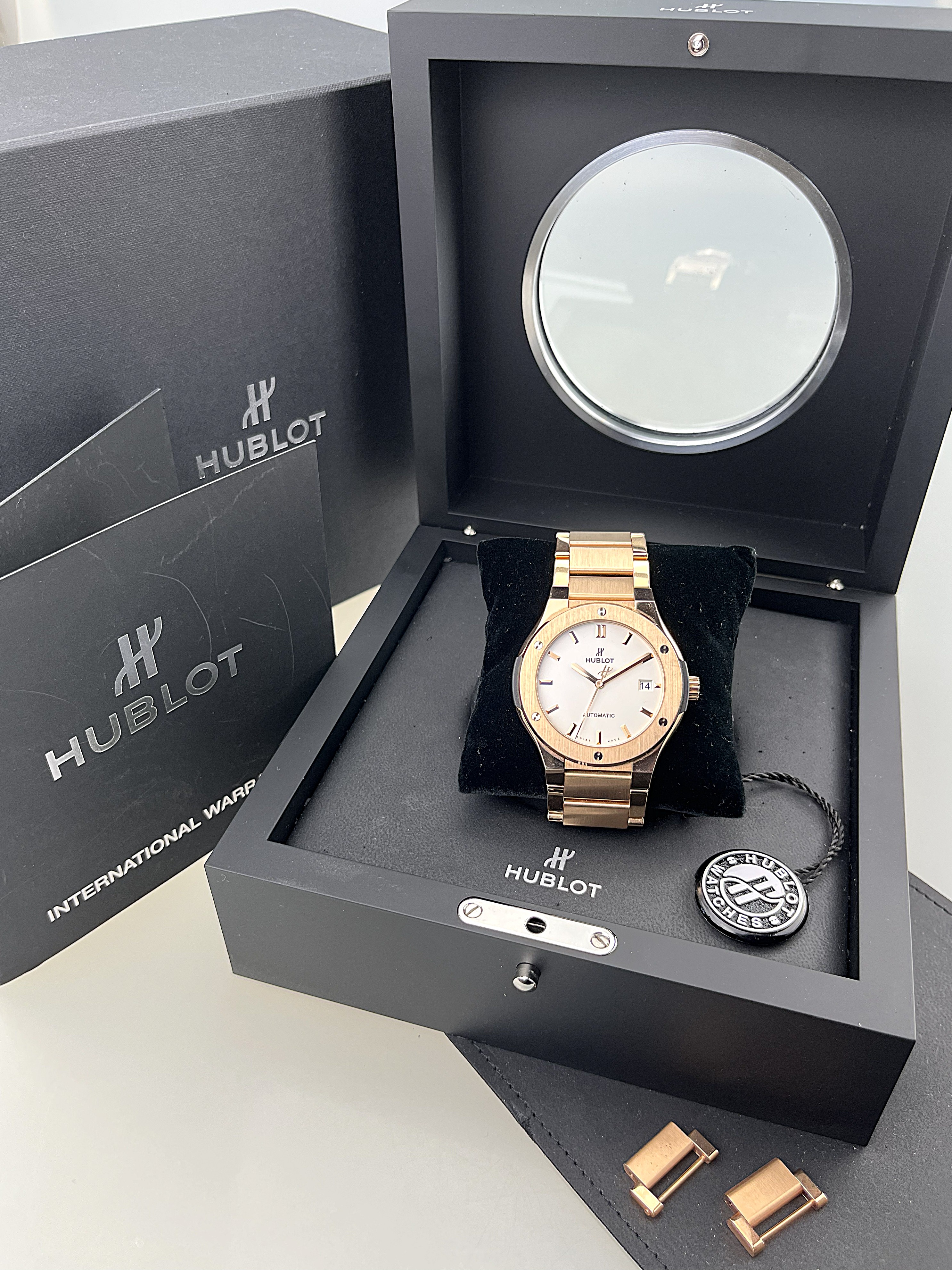 Hublot ist es gelungen, die feine, reduzierte Gesamtoptik des Zifferblatts mit der Präsenz eines eleganten, auffälligen aber nicht aufdringlichen, hochglanzpolierten 45mm Gehäuses zu kombinieren, welches über eine satinierte Lünette mit ebenfalls hochglanzpolierten Schräubchen verfügt. Finalisiert wird das harmonische Gesamtbild durch ein massives, sportlich elegantes Armband, welches mittig satiniert und am Rand hochglanzpoliert ist.