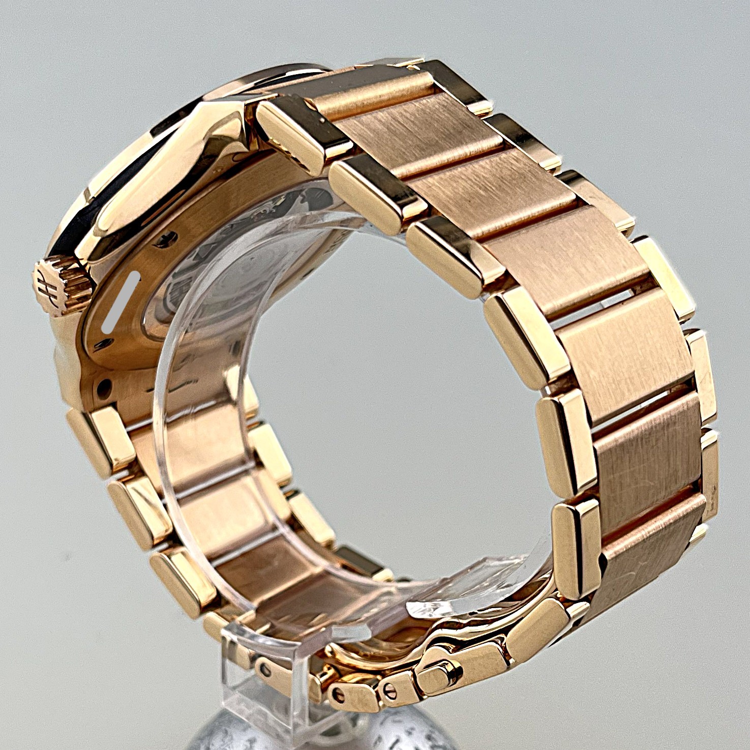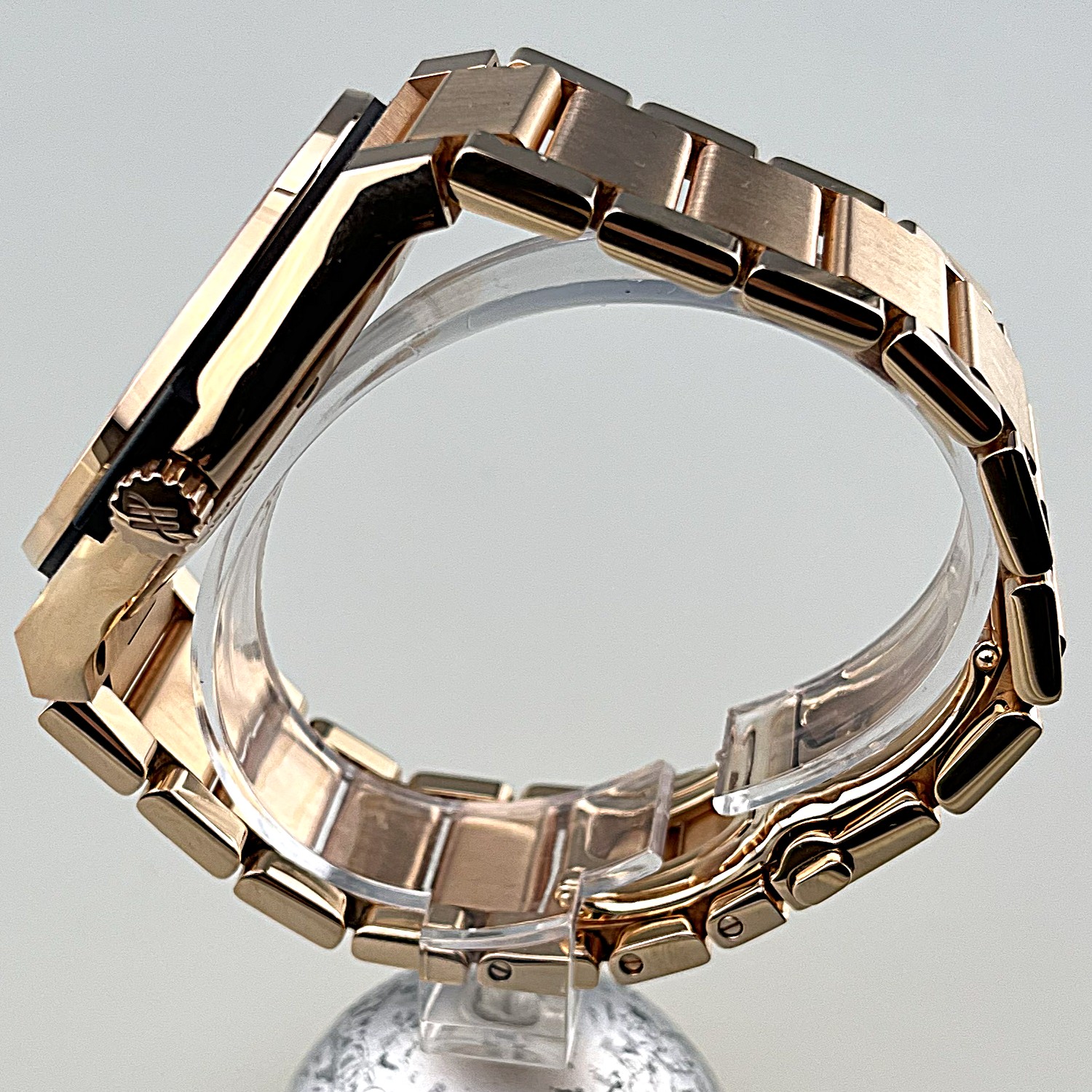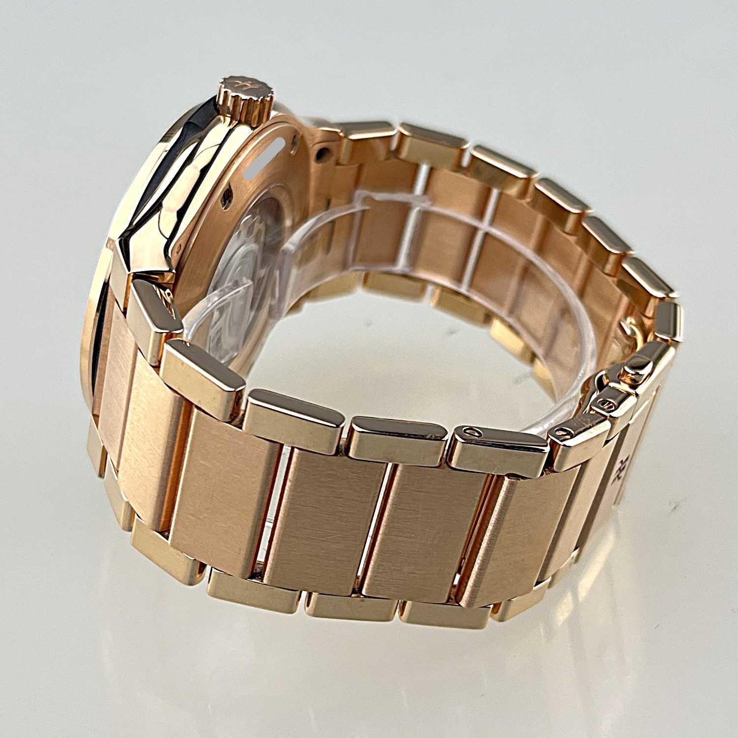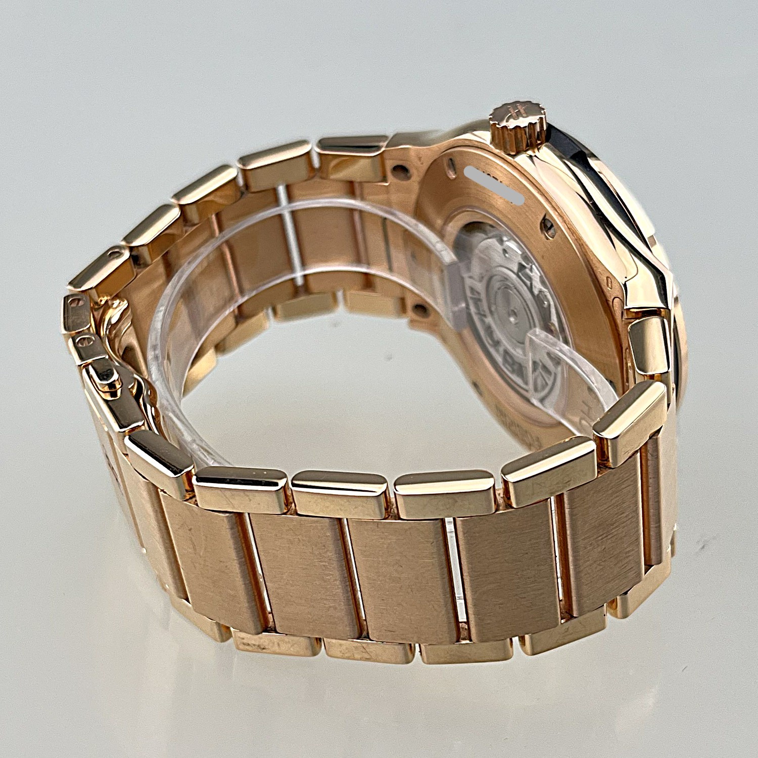 Die verdeckte Faltschließe - ebenfalls aus 18 K Roségold - sorgt für höchsten Komfort sowohl beim An- und Ablegen und Tragen dieses seltenen Schmuckstücks. Das Gesamtgewicht inklusive der beim Kauf des Erstbesitzers entnommenen 2 Bandelemente beträgt ca. 236,6 g.