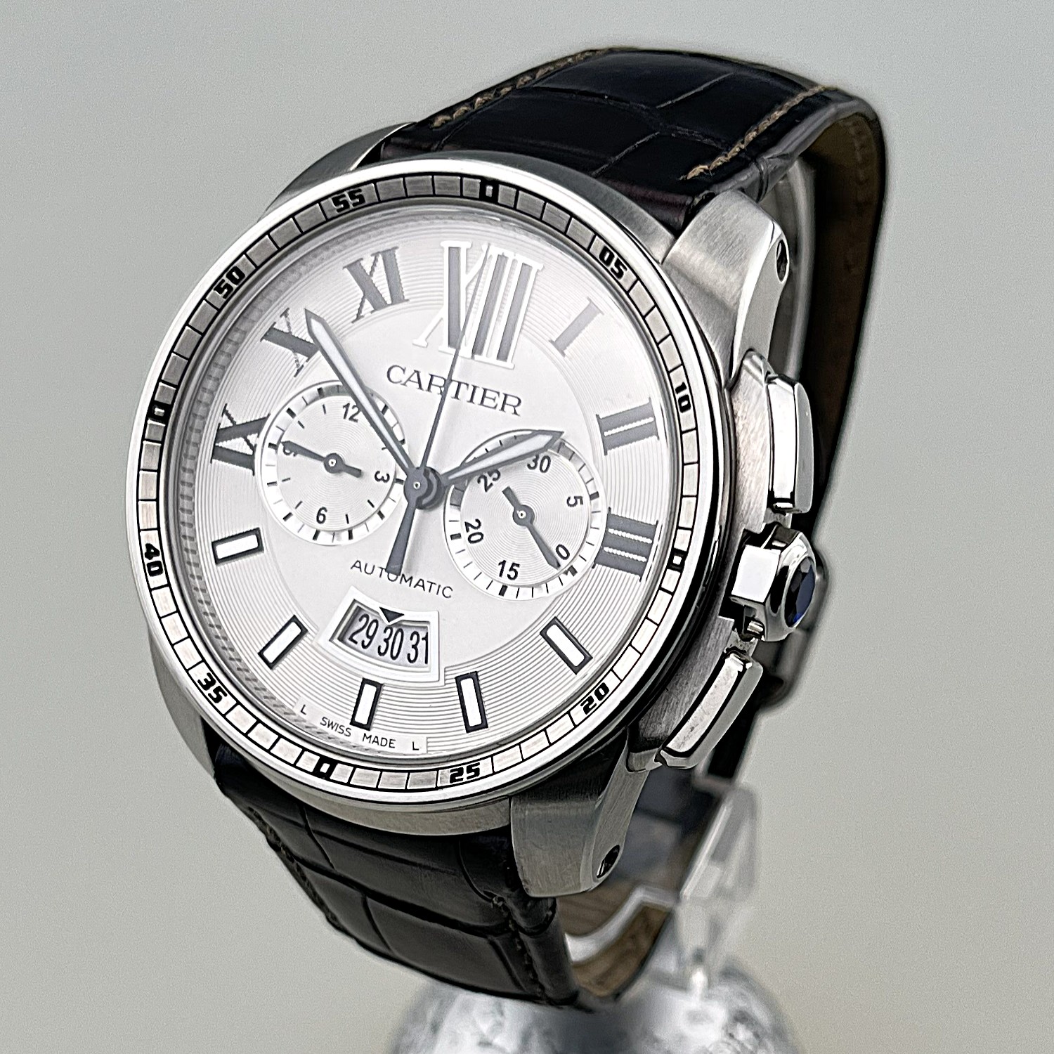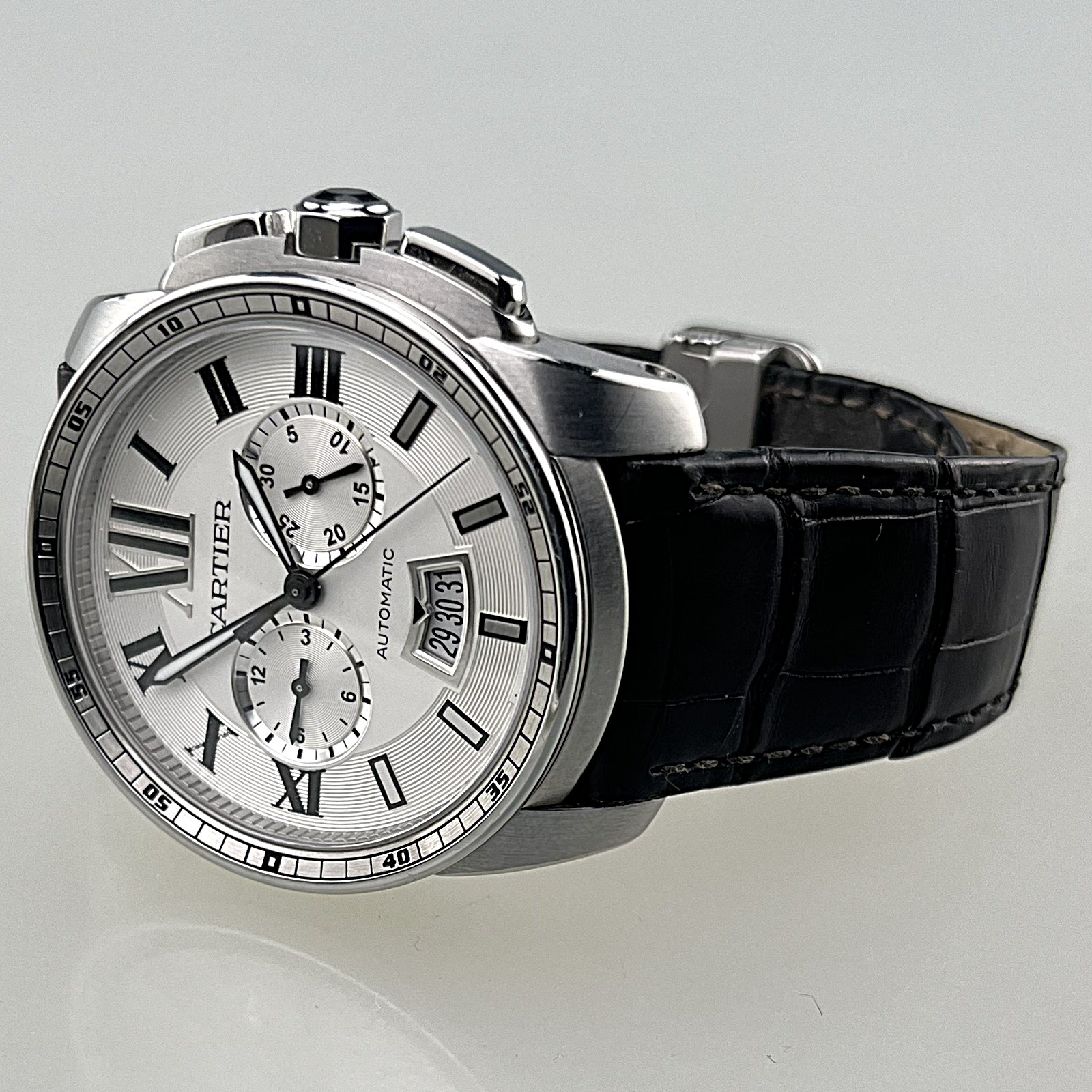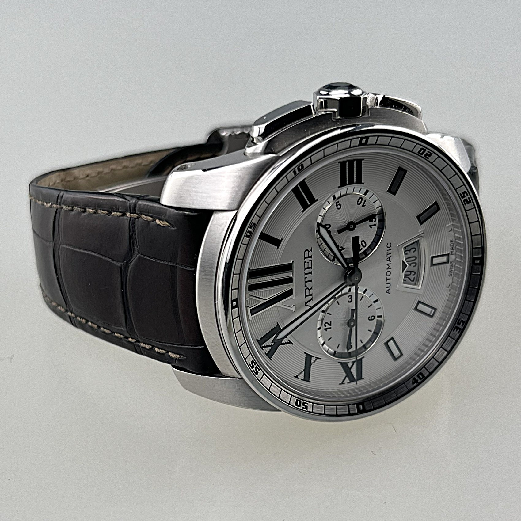 Cartier Calibre de Cartier Chronograph, Edelstahlgehäuse, Lederarmband mit Faltschließe, Erstkauf 12/2021, hervorragender Zustand, Full Set
