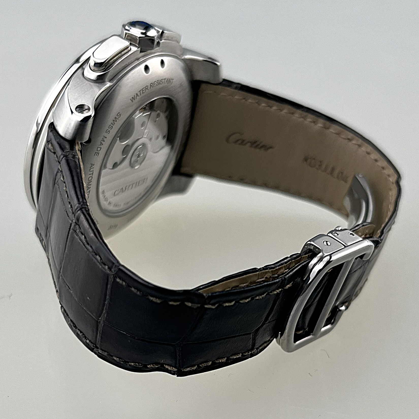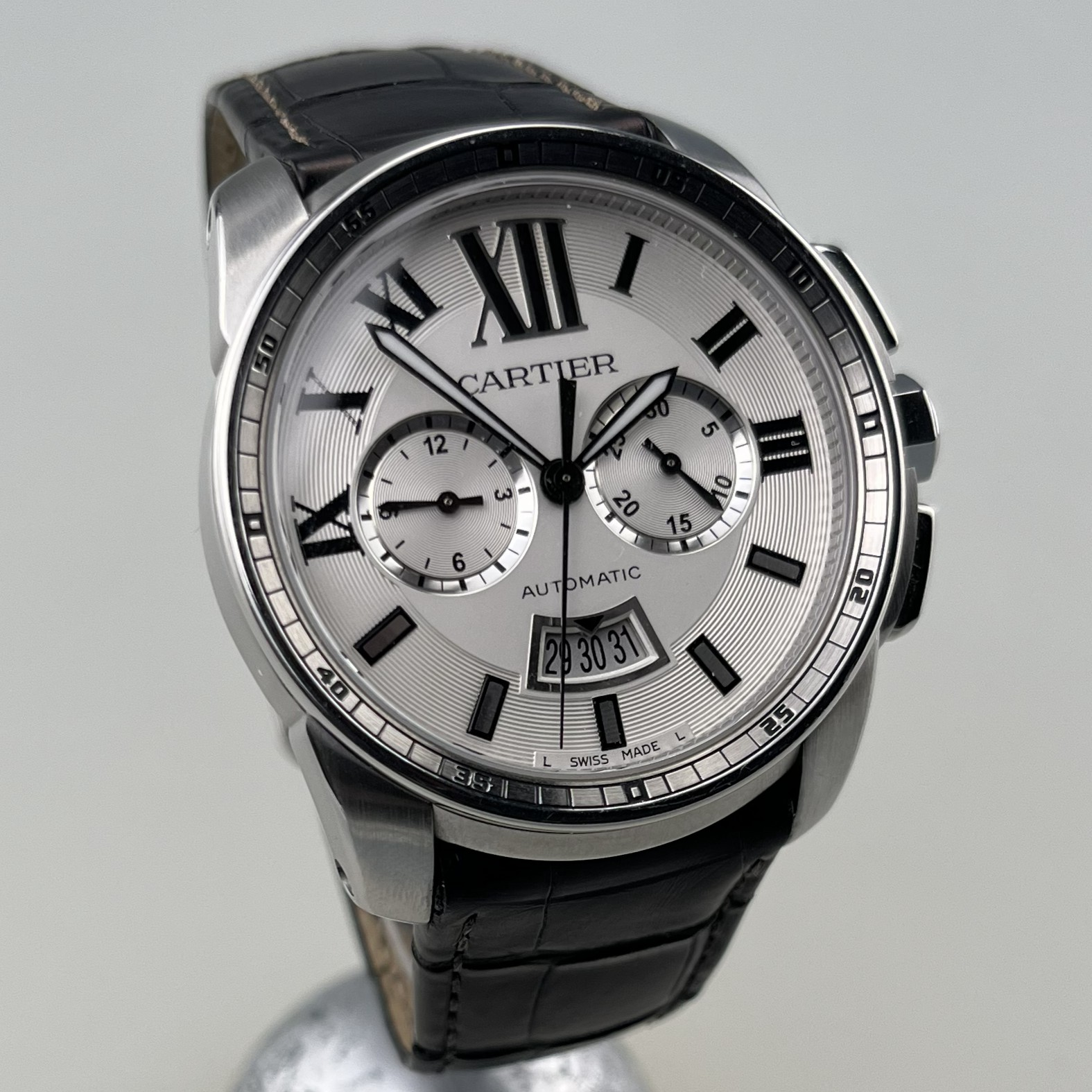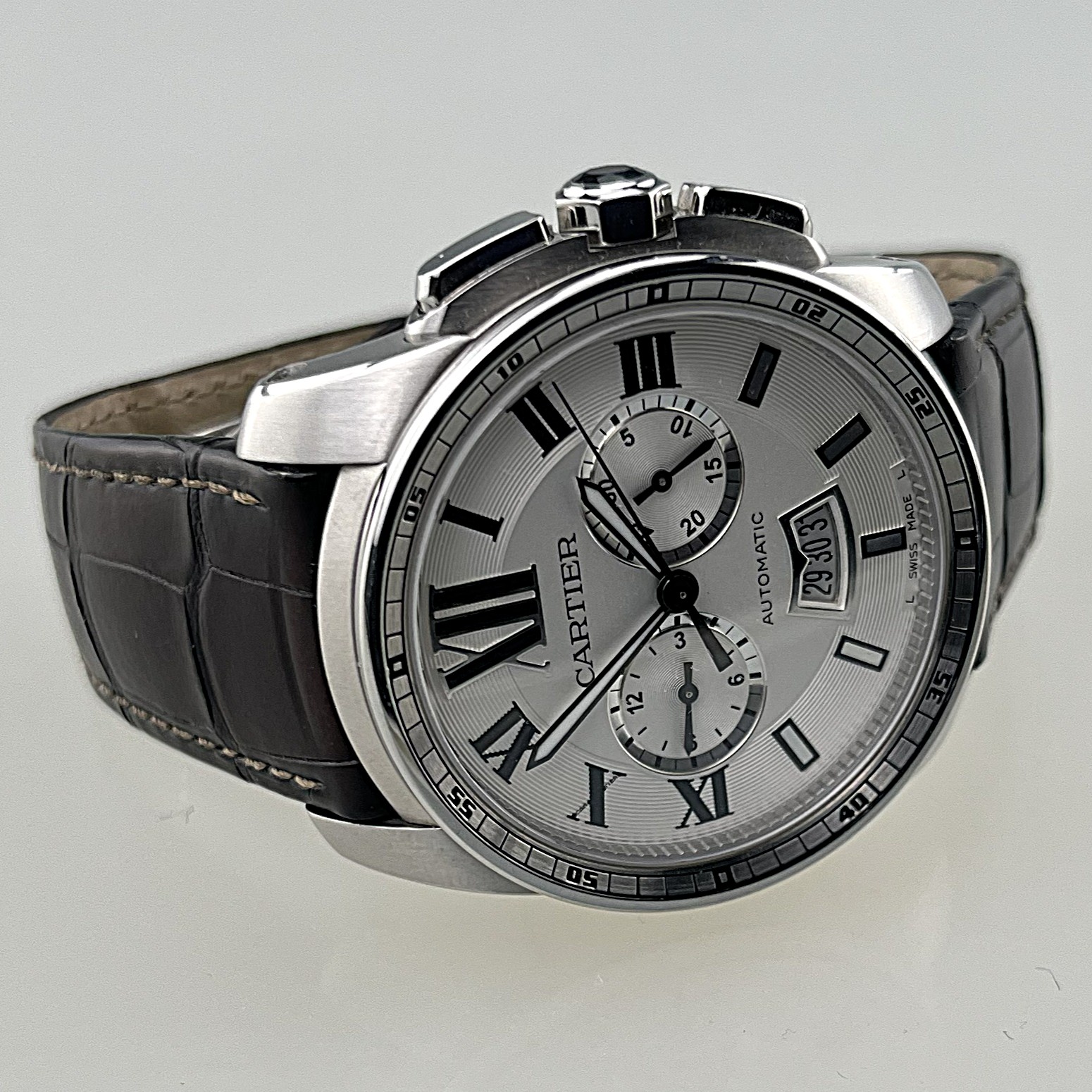 Cartier Calibre de Cartier Chronograph, Edelstahlgehäuse, Lederarmband mit Faltschließe, Erstkauf 12/2021, hervorragender Zustand, Full Set
