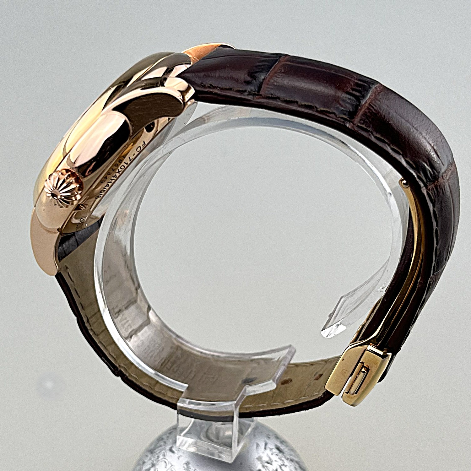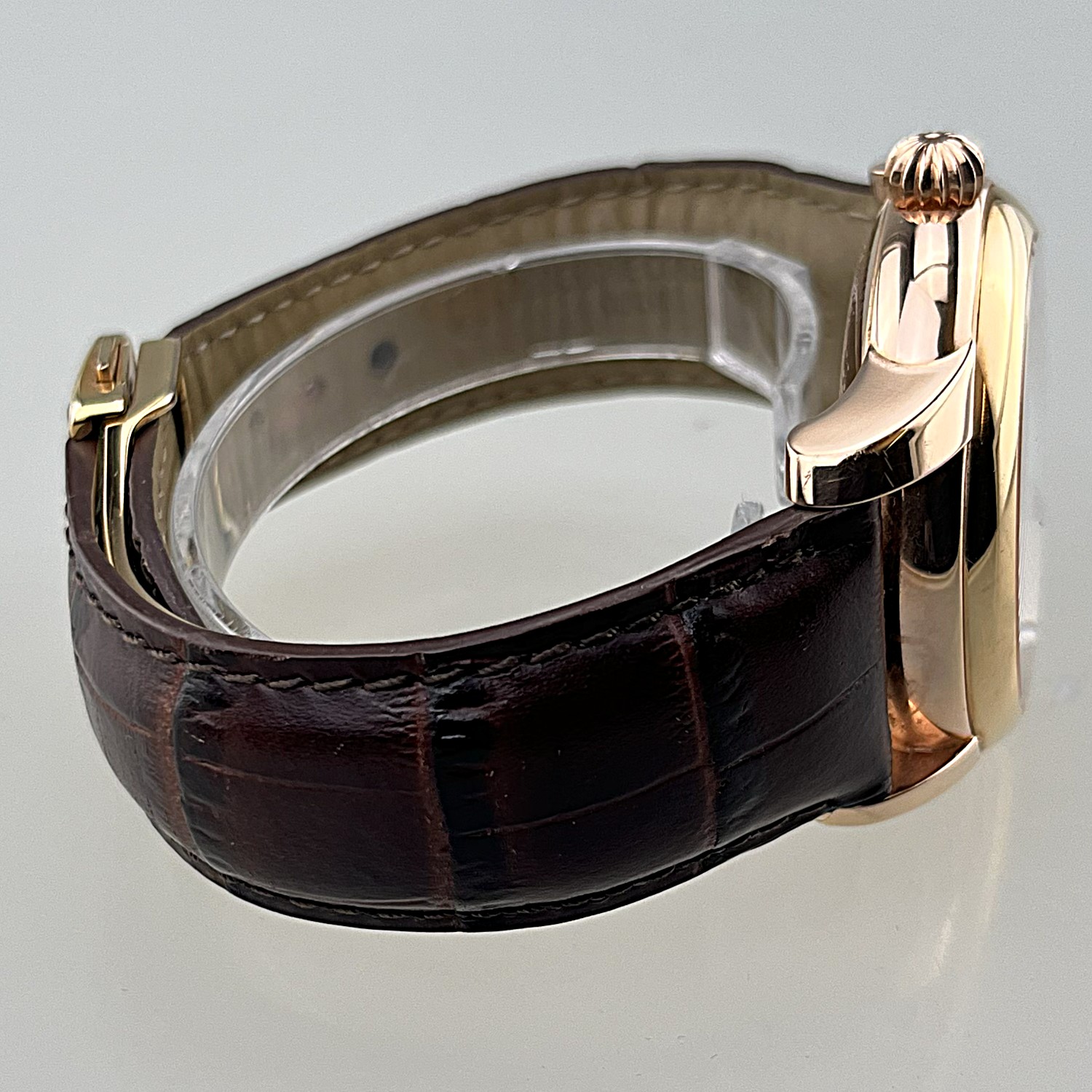 Das Roségold plattierte Edelstahlgehäuse mit einem Durchmesser von 42 Millimetern verbindet klassische Eleganz mit moderner Präzision. Das silberne Zifferblatt, akzentuiert durch feine Indexe und Zeiger, strahlt eine zeitlose Klarheit aus, die durch das braune Aligator-Lederarmband mit Dornschließe harmonisch ergänzt wird. Die Seitenansicht unterstreicht die schlanke Linienführung des Gehäuses, während der Sichtboden auf der Rückseite Einblicke in das innere Werk gewährt.